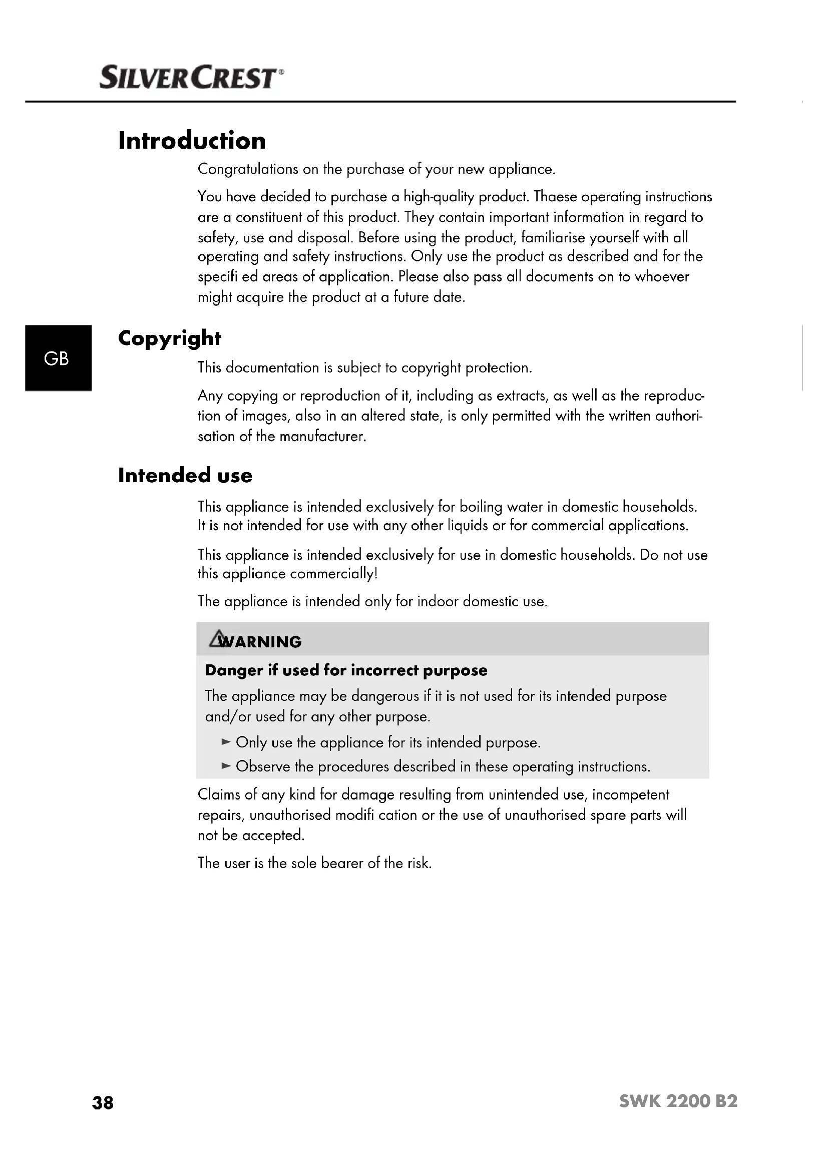 Introduction Congratulations on the purchase of your new appliance. You have decided to purchase a high-quality product. Thaese operating instructions are a constituent of this product. They contain important information in regard to safety, use and disposal. Before using the product, familiarise yourself with all operating and safety instructions. Only use the product as described and for the specifi ed areas of application. Please also pass all documents on to whoever might acquire the product at a future date. Copyright This documentation is subject to copyright protection. Any copying or reproduction of it, including as extracts, as well as the reproduc- tion of images, also in an altered state, is only permitted with the written authori- sation of the manufacturer. Intended use This appliance is intended exclusively for boiling water in domestic households. It is not intended for use with any other liquids or for commercial applications. This appliance is intended exclusively for use in domestic households. Do not use this appliance commercially! The appliance is intended only for indoor domestic use. WARNING Danger if used for incorrect purpose The appliance may be dangerous if it is not used for its intended purpose and/or used for any other purpose. ► Only use the appliance for its intended purpose. ► Observe the procedures described in these operating instructions. Claims of any kind for damage resulting from unintended use, incompetent repairs, unauthorised modifi cation or the use of unauthorised spare parts will not be accepted. The user is the sole bearer of the risk. IB_111451_SWK2200B2_CH.indb 38 06.01.15 09:1939 SWK 2200 B2