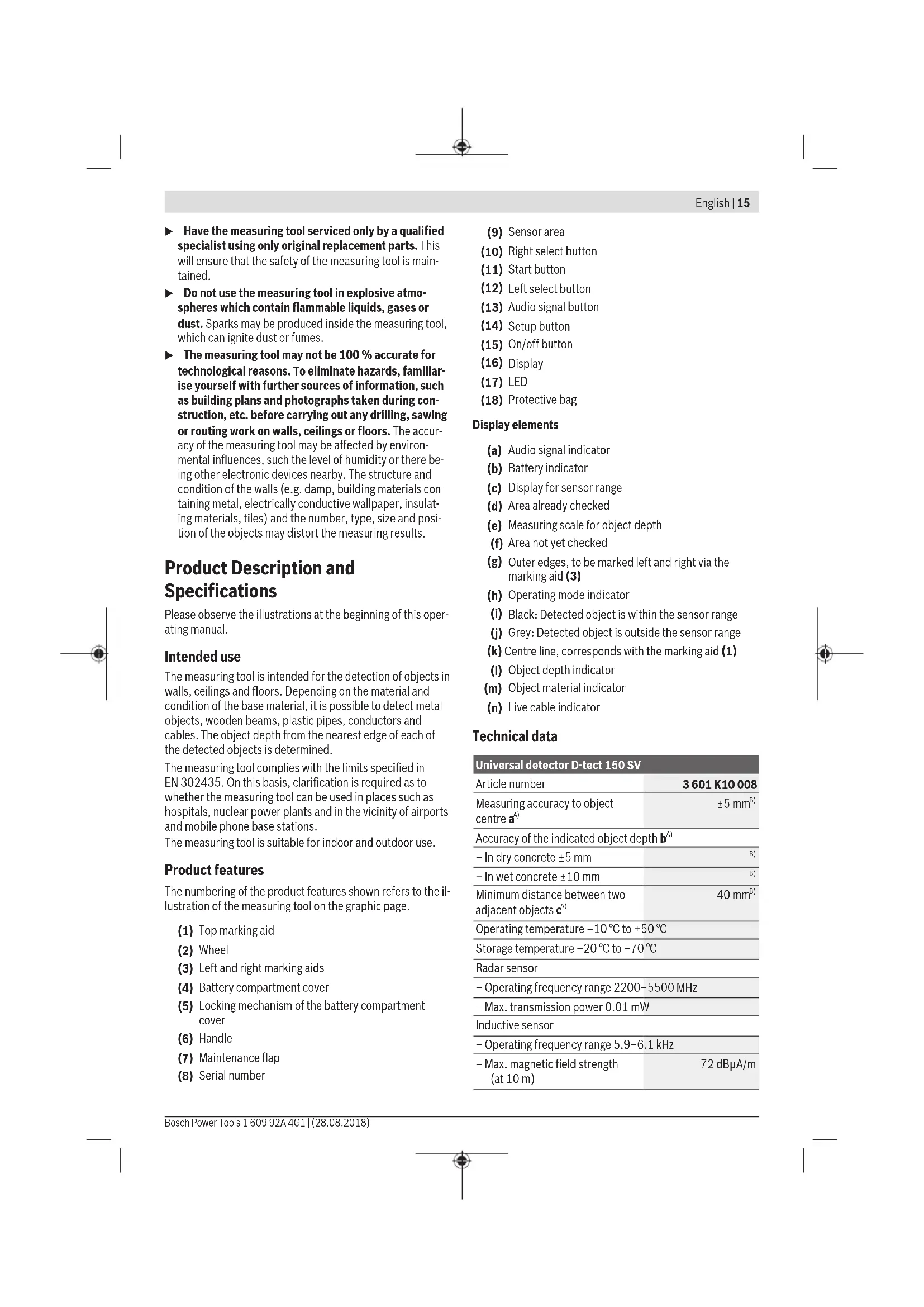 The measuring tool checks the base material of the sensor area (9) in the meas- urement directionA up to the displayed measuring depth. You can only carry out a measurement while the measuring tool is being moved in travel directionB and with a minimum measur- ing path of 10cm. Always move the measuring tool in a straight line while apply- ing light pressure to hold it against the wall, so that the wheels remain in contact with the wall. Objects are de- tected that differ from the material of the wall. The ob- ject depth is indicated on the display, as well as the ma- terial of the object, where possible. Optimum results are achieved when the measuring path is at least 40cm and the measuring tool is moved slowly across the entire area to be checked. The tool's function allows for reliable detection of the nearest edges of objects that run transverse to the direction of movement of the measuring tool. For this reason, always move crosswise over the area to be checked. If multiple objects are located over each other in the wall, the display will indicate the object whose surface is nearest to the measuring tool. The properties of the detected objects as shown on the dis- play(16) may differ from the actual object properties. In particular, very thin objects appear thicker on the display. Larger, cylindrical objects (e.g. plastic pipes or water pipes) may appear narrower on the display than they actually are. Detectable objects – Plastic pipes (e.g. water-filled plastic pipes, such as un- derfloor or wall heating pipes, etc. with a diameter of at least 10mm, or empty pipes with a diameter of at least 20mm) – Electrical cables (regardless of whether live or not) – Three-phase power cables (e.g. to oven) – Low-voltage cables (e.g. doorbell, telephone) – All types of metal pipe, rod or carrier (e.g. steel, copper, aluminium) – Reinforcing steel – Wooden beams – Cavities Possible measurements – In concrete/reinforced concrete – In masonry (bricks, porous concrete, expanded concrete, pumice, calcareous sandstone) – In lightweight partition walls – Beneath surfaces such as plaster, tiles, wallpaper, par- quet, carpet – Behind wood, plasterboard Special measuring cases Unfavourable conditions fundamentally impair the measur- ing result: – Multi-layered walls – Empty plastic pipes and wooden beams in cavities and lightweight partition walls – Objects lying at an angle in the wall – Wet wall material – Metal surfaces – Cavities in a wall; these may be displayed as objects – Proximity to devices that generate strong magnetic or electromagnetic fields, e.g. mobile phone base stations or generators Start-up Switching on/off u Before switching on the measuring tool, ensure that the sensor area(9) is dry. If necessary, use a cloth to dry the measuring tool. u If the measuring tool has been exposed to a significant change in temperature, leave it to adjust to the ambi- ent temperature before switching it on. Switching on – To switch on the measuring tool, press the on/off but- ton(15) or the start button(11). – The LED(17) lights up green and the start screen ap- pears on the display(16) for 4s. – If you do not carry out a measurement or press a button on the measuring tool, it switches off automatically after 5min. You can change this <Cut-off time> in the Settings menu (see "<Cut-off time>", page20). Switching off – To switch off the measuring tool, press the on/off but- ton(15). – When the measuring tool is switched off, all settings se- lected in the menus are retained. Switching audio signal on/off The audio signal can be switched on and off using the audio signal button(13). In the Settings menu, select the signal types in the <Tone signal> sub-menu (see "<Tone signal>", page20). Measuring process Switch on the measuring tool. The default display screen ap- pears on the display(16). English | 17 Bosch Power Tools 1 609 92A 4G1 | (28.08.2018)18 | English 1 609 92A 4G1 | (28.08.2018) Bosch Power Tools Concrete Universal Prev. NextSensor 0 cm 0 cm Move Place the measuring tool onto the wall and move it over the wall the direction of travel (see "How it works (seefigureB)", page17)The measuring results are shown on the dis- play(16) after a minimum measuring path of 10cm. To ob- tain accurate measuring results, move the measuring tool slowly over the entire area you believe to be occupied by an object in the wall. If you lift the measuring tool away from the wall during the measuring process, or do not use it (movement, press of button) for longer than 2min, the last measuring result ob- tained remains on the display. The message<Hold> appears on the display for the sensor range(c). Place the measuring tool against the wall again, move it again or press the start button(11) to begin a new measuring process. If the LED(17) lights up red, there is an object within the sensor range. If the LED(17) lights up green, there is no ob- ject within the sensor range. If the LED(17) flashes red, there is a live object within the sensor range. u Before drilling, sawing or routing into walls, refer to other sources of information to ensure that you elim- inate hazards. Since the measuring results can be influ- enced by ambient conditions or the wall material, there may be a hazard even though the indicator does not indic- ate an object within the sensor range (the LED (17) lights up green). Display elements (see figure A) If there is an object within the sensor range, it will appear on the display inside the sensor range(c). Depending on the size and depth of the object, the measuring tool may be able to identify its material. The object depth(l) from the nearest edge of the detected object is displayed in the status bar. Note: Both the object depth indicator(l) and the material property indicator(m) relate to the object shown in black on the sensor screen. The object material indicator(m) can show the following properties: