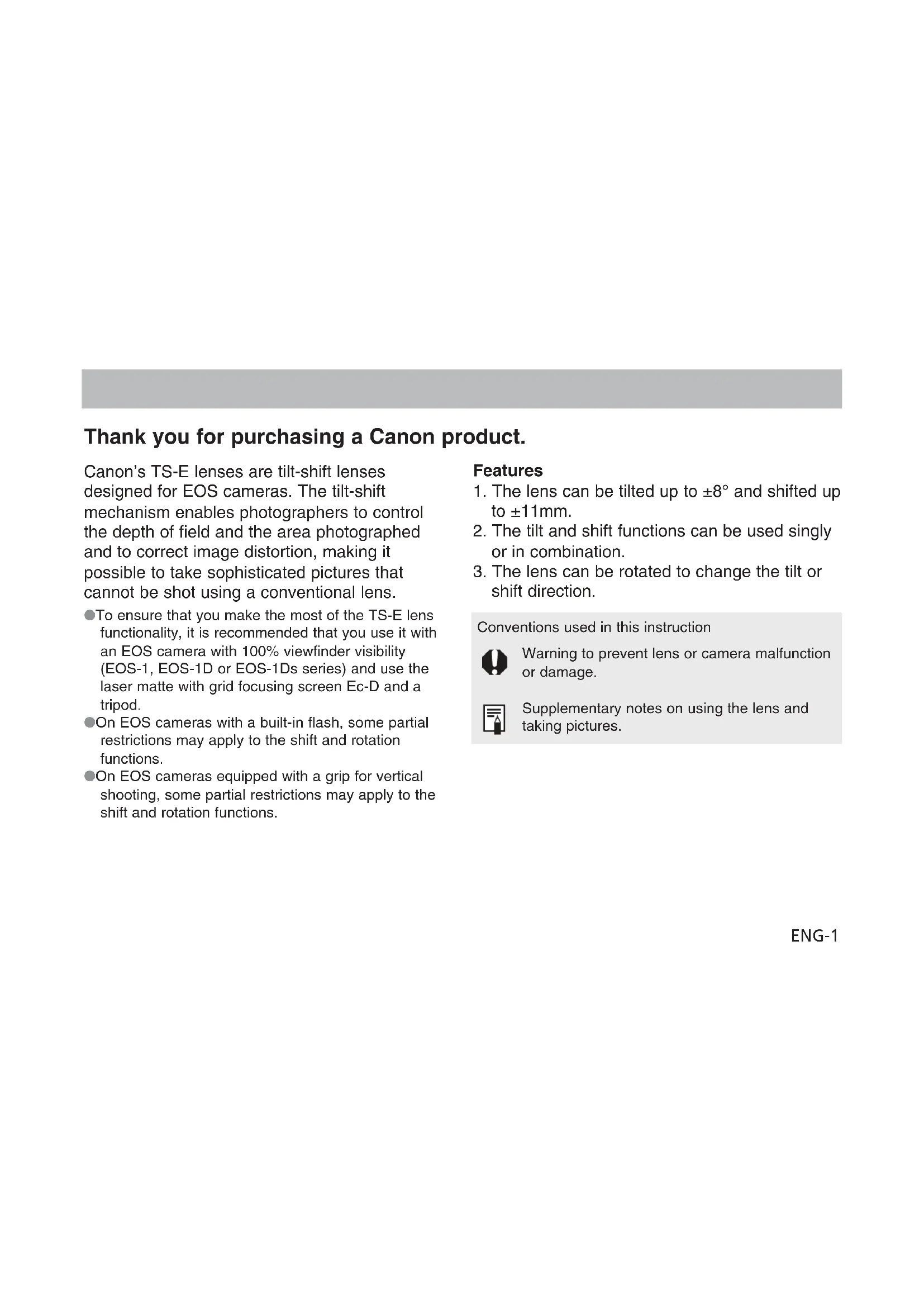shift direction. Conventions used in this instruction Warning to prevent lens or camera malfunction or damage. Supplementary notes on using the lens and taking pictures. Thank you for purchasing a Canon product.ENG-2 a Safety Precautions This device complies with Part 15 of the FCC Rules. Operation is subject to the following two conditions: (1) This device may not cause harmful interference, and (2) this device must accept any interference received, including interference that may cause undesired operation. Do not make any changes or modifications to the equipment unless otherwise specified in the instructions. If such changes or modifications should be made, you could be required to stop operation of the equipment. This equipment has been tested and found to comply with the limits for a class B digital device, pursuant to part 15 of the FCC Rules. These limits are designed to provide reasonable protection against harmful interference in a residential installation. This equipment generates, uses and can radiate radio frequency energy and, if not installed and used in accordance with the instructions, may cause harmful interference to radio communications. However, there is no guarantee that interference will not occur in a particular installation. If this equipment does cause harmful interference to radio or television reception, which can be determined by turning the equipment off and on, the user is encouraged to try to correct the interference by one or more of the following measures: