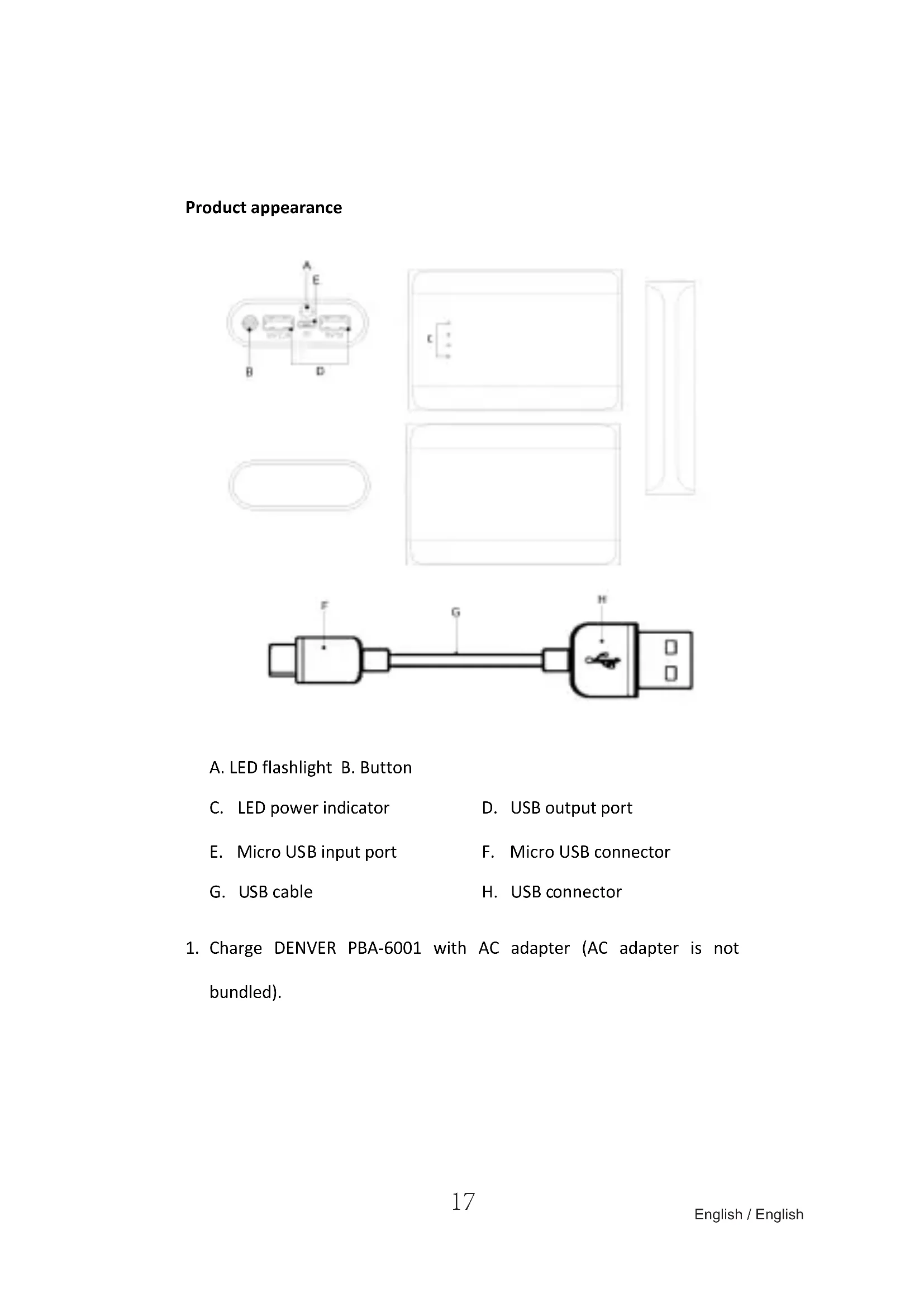 - Charge DENVER PBA-6001 with AC adapter (AC adapter is not bundled).