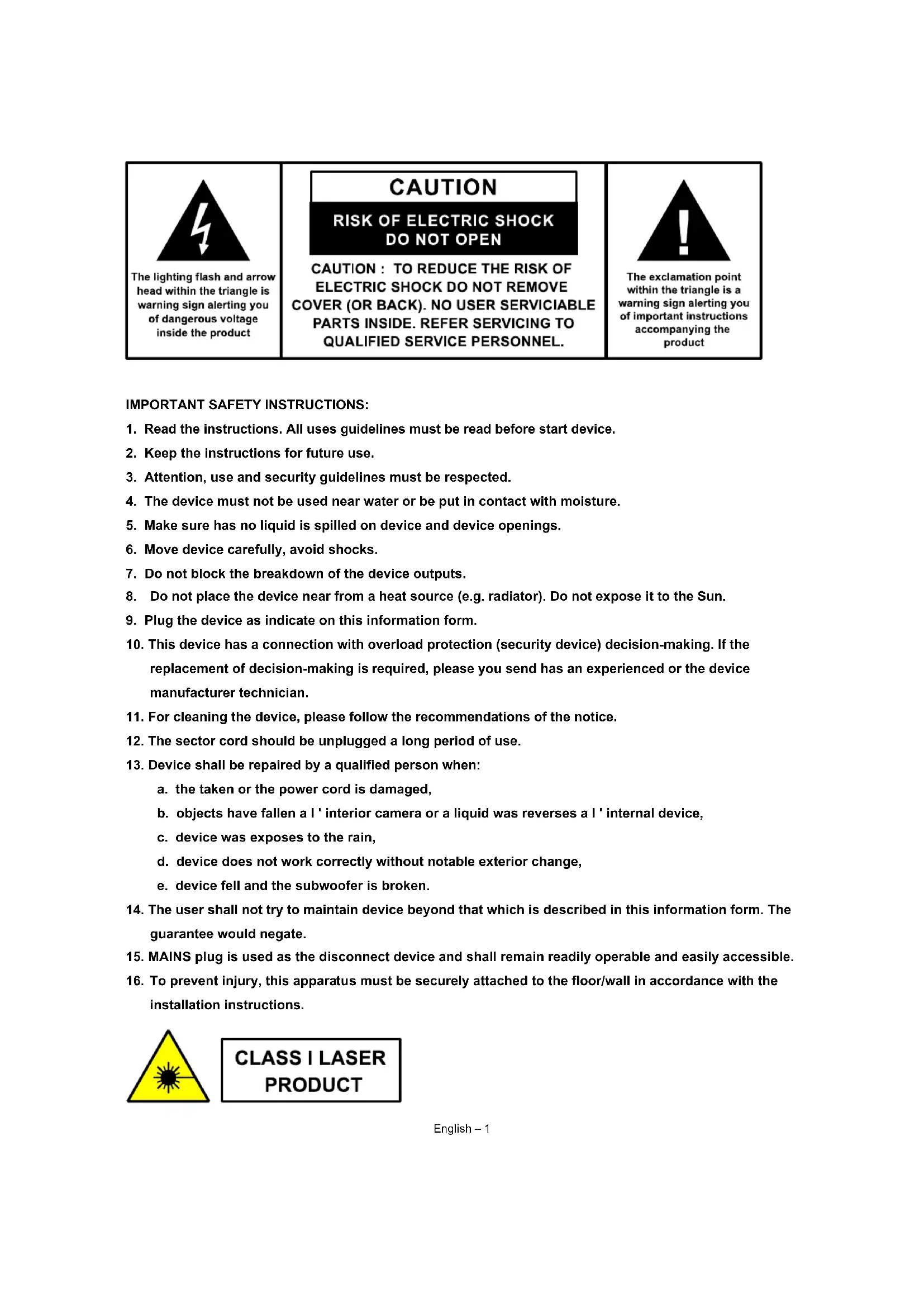 a. the taken or the power cord is damaged, b. objects have fallen a I ' interior camera or a liquid was reverses a I ' internal device, c. device was exposes to the rain, d. device does not work correctly without notable exterior change, e. device fell and the subwoofer is broken.