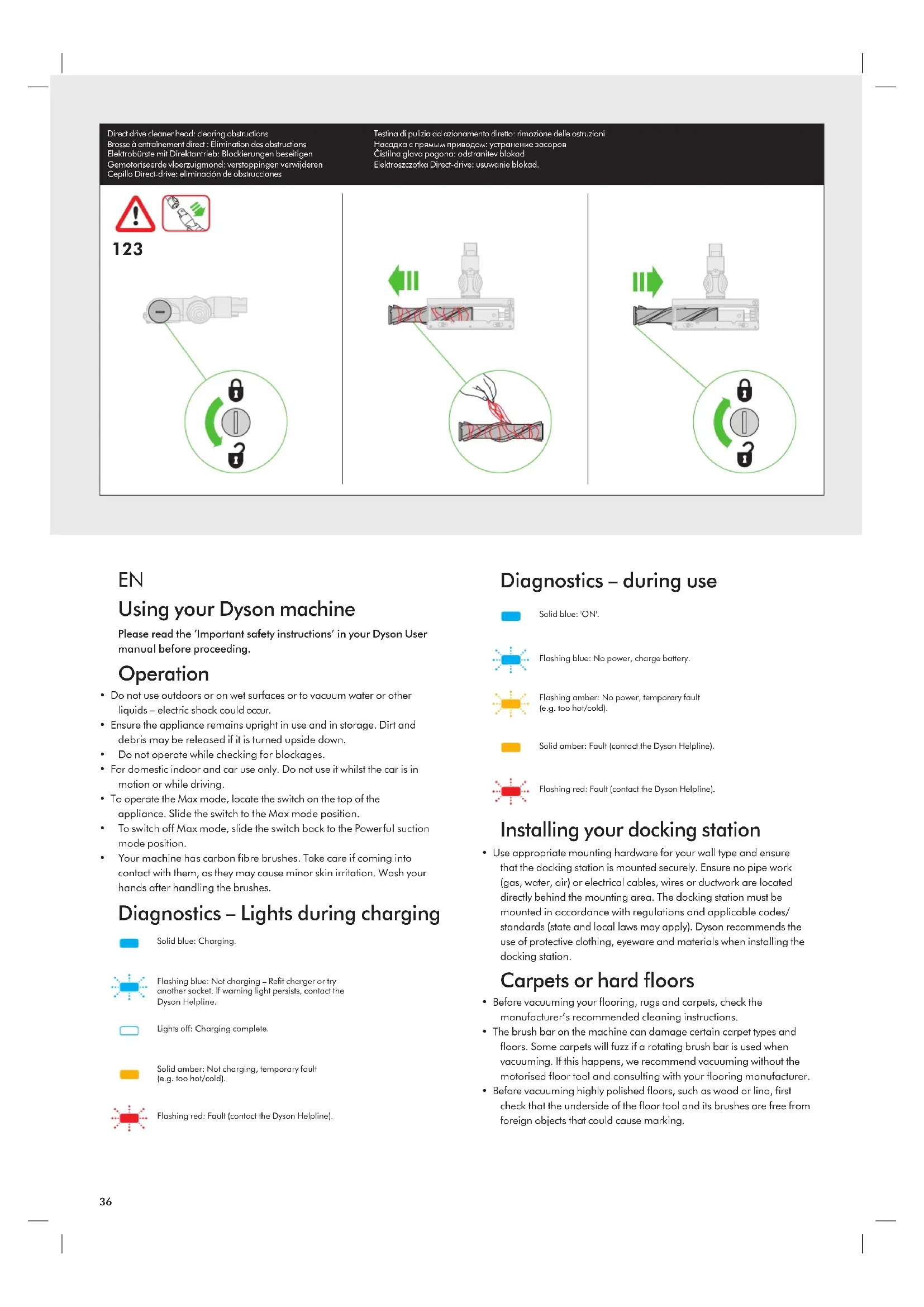 - Your machine has carbon fibre brushes. Take care if coming into contact with them, as they may cause minor skin irritation. Wash your hands after handling the brushes. Diagnostics – Lights during charging Diagnostics – during use Installing your docking station