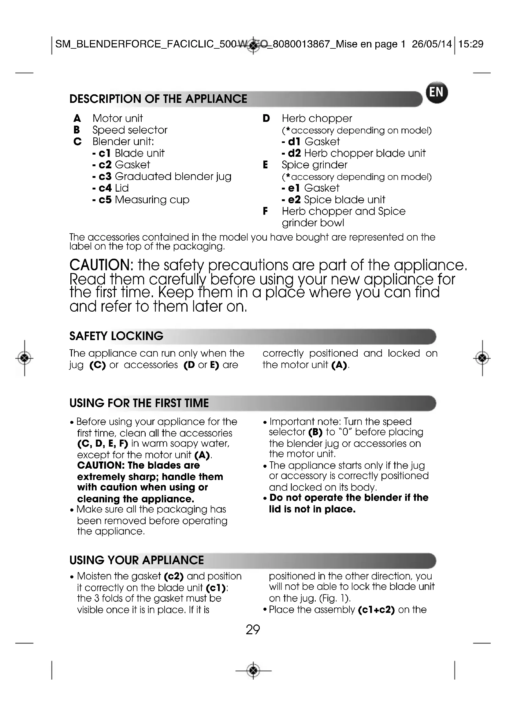 Herb chopper (*accessory depending on model) - d1 Gasket - d2 Herb chopper blade unit Spice grinder (*accessory depending on model) - e1 Gasket - e2 Spice blade unit Herb chopper and Spice grinder bowl The accessories contained in the model you have bought are represented on thelabel on the top of the packaging. CAUTION: the safety precautions are part of the appliance. Read them carefully before using your new appliance for the first time. Keep them in a place where you can find and refer to them later on. SAFETY LOCKING