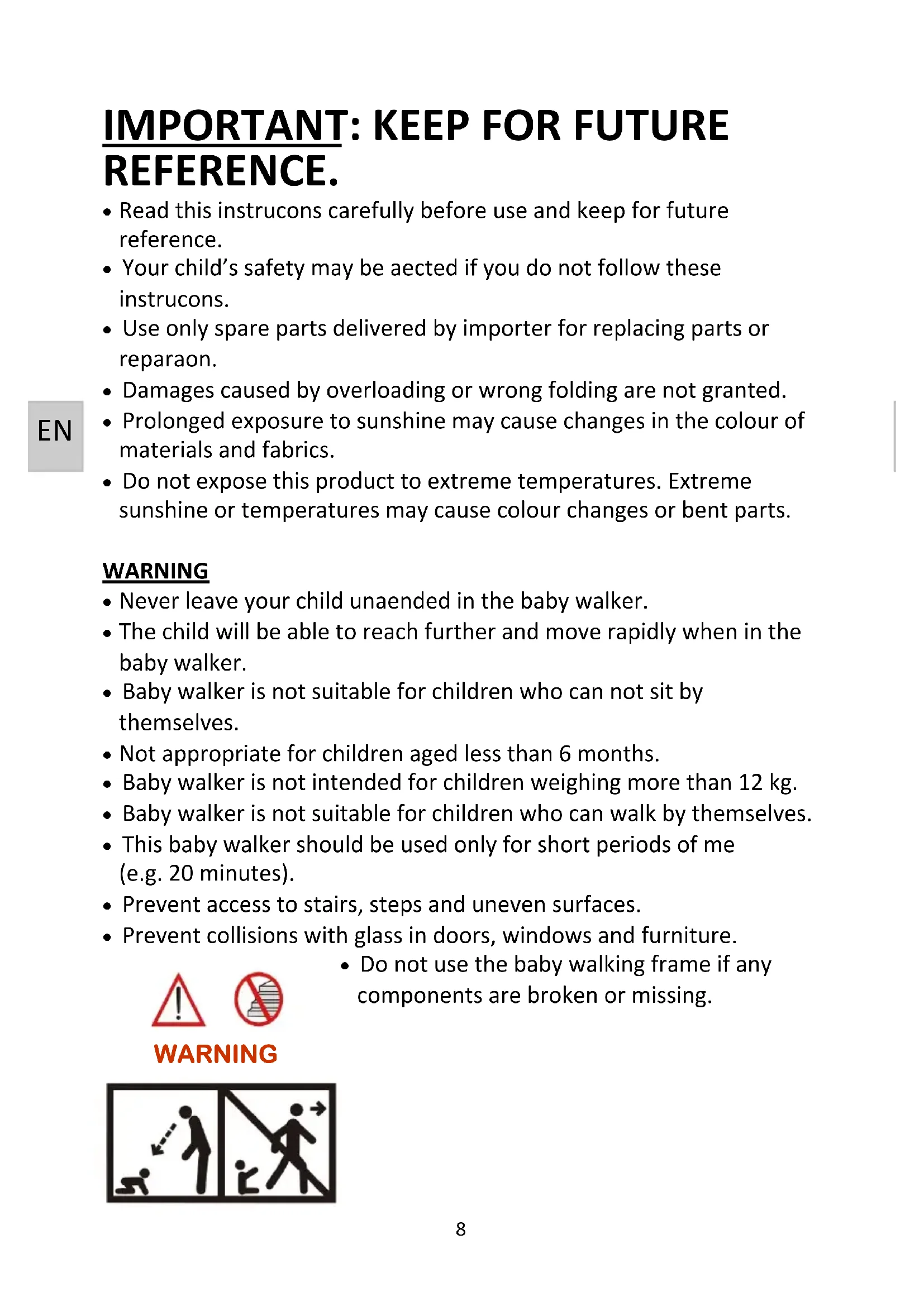 - Do not allow any children, animals or other object to be placed near the baby walker while child is seated in the baby walker.