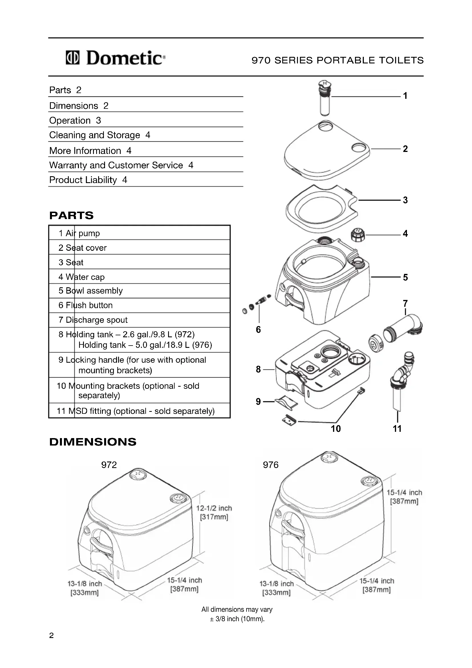 1 Air pump 2 Seat cover 3 Seat 4 Water cap 5 Bowl assembly 6 Flush button 7 Discharge spout 8 Holding tank – 2.6 gal./9.8 L (972) Holding tank – 5.0 gal./18.9 L (976) 9 Locking handle (for use with optional mounting brackets) 10 Mounting brackets (optional - sold separately) 11 MSD fitting (optional - sold separately) All dimensions may vary ± 3/8 inch (10mm).