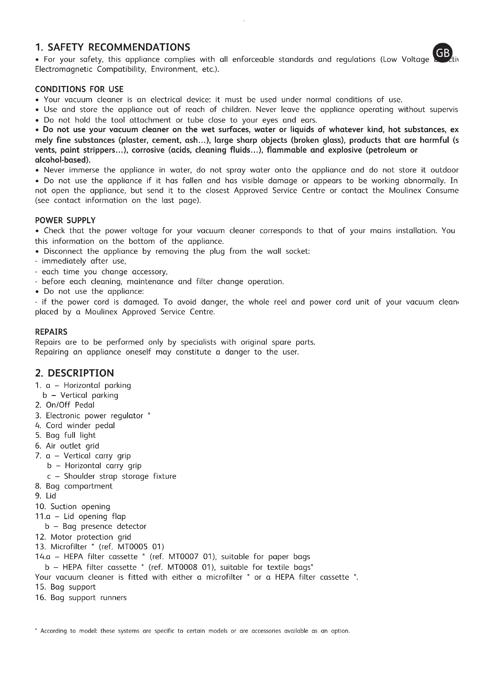 14.a – HEPA filter cassette * (ref. MT0007 01), suitable for paper bags b – HEPA filter cassette * (ref. MT0008 01), suitable for textile bags* Your vacuum cleaner is fitted with either a microfilter * or a HEPA filter cassette *.