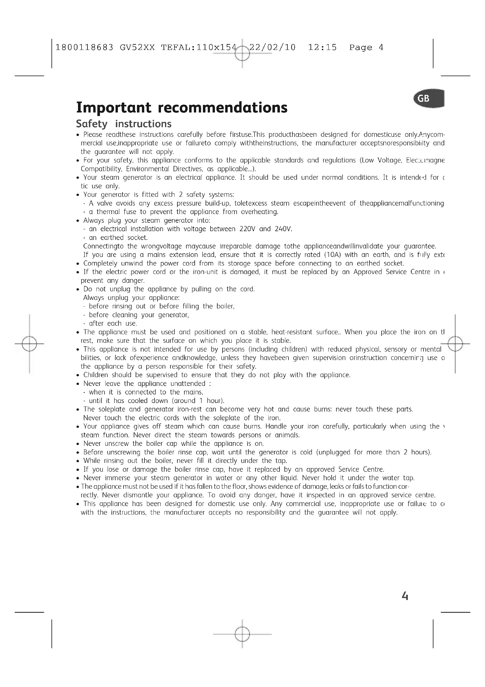 - Always plug your steam generator into: - an electrical installation with voltage between 220V and 240V. - an earthed socket. Connectingto the wrongvoltage maycause irreparable damage tothe applianceandwillinvalidate your guarantee. If you are using a mains extension lead, ensure that it is correctly rated (10A) with an earth, and is fully extended.