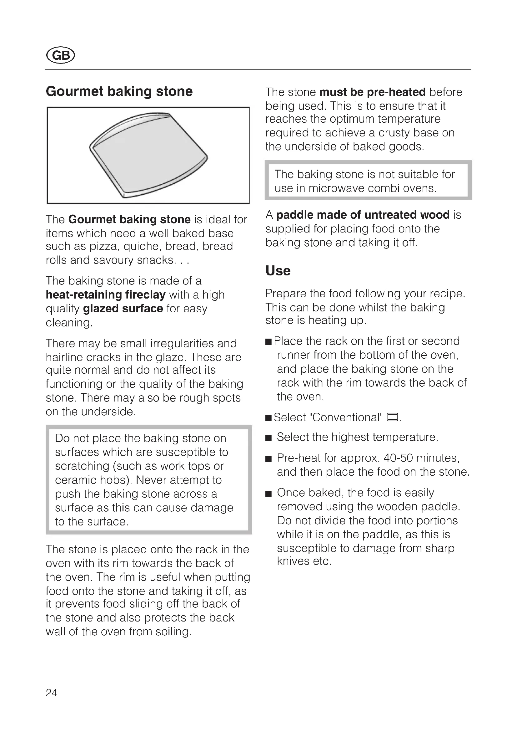 23Gourmet baking stone The Gourmet baking stone is ideal for items which need a well baked base such as pizza, quiche, bread, bread rolls and savoury snacks. . . The baking stone is made of a heat-retaining fireclay with a high quality glazed surface for easy cleaning. There may be small irregularities and hairline cracks in the glaze. These are quite normal and do not affect its functioning or the quality of the baking stone. There may also be rough spots on the underside. Do not place the baking stone on surfaces which are susceptible to scratching (such as work tops or ceramic hobs). Never attempt to push the baking stone across a surface as this can cause damage to the surface. The stone is placed onto the rack in the oven with its rim towards the back of the oven. The rim is useful when putting food onto the stone and taking it off, as it prevents food sliding off the back of the stone and also protects the back wall of the oven from soiling. The stone must be pre-heated before being used. This is to ensure that it reaches the optimum temperature required to achieve a crusty base on the underside of baked goods. The baking stone is not suitable for use in microwave combi ovens. A paddle made of untreated wood is supplied for placing food onto the baking stone and taking it off. Use Prepare the food following your recipe. This can be done whilst the baking stone is heating up. ^ Place the rack on the first or second runner from the bottom of the oven, and place the baking stone on the rack with the rim towards the back of the oven. ^ Select "Conventional" A.