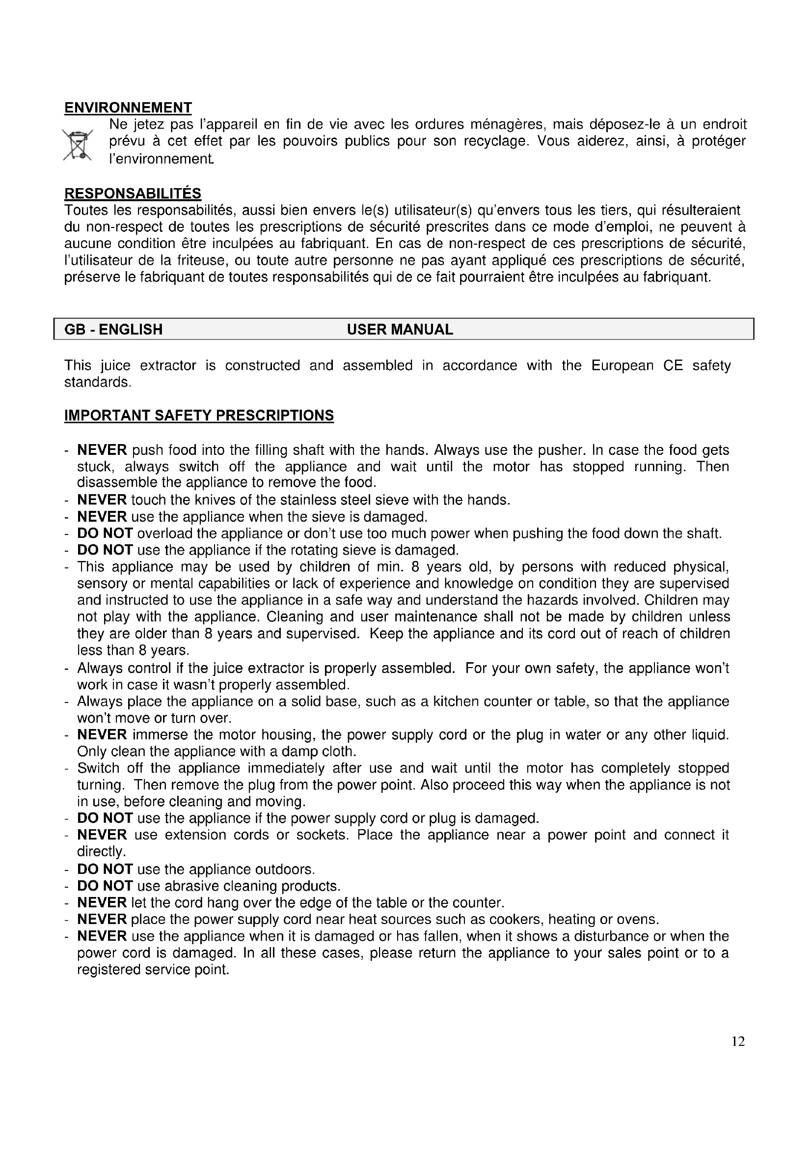 This juice extractor is constructed and assembled in accordance with the European CE safety standards.