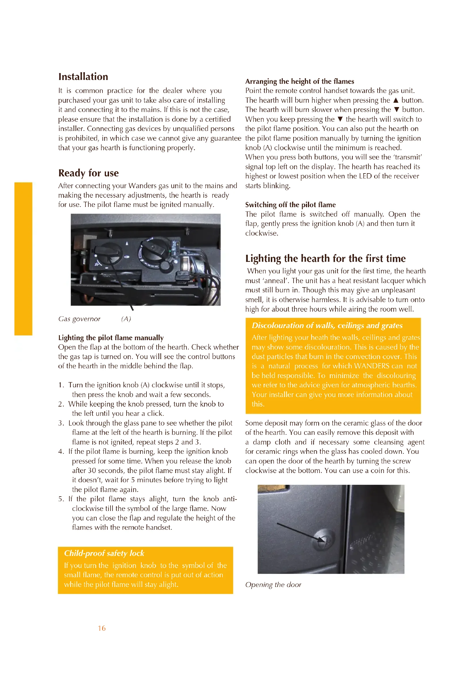 clockwise till the symbol of the large flame. Now you can close the flap and regulate the height of the flames with the remote handset. Child-proof safety lock If you turn the ignition knob to the symbol of the small flame, the remote control is put out of action while the pilot flame will stay alight. Arranging the height of the flames Point the remote control handset towards the gas unit. The hearth will burn higher when pressing the ▲ button. The hearth will burn slower when pressing the ▼ button. When you keep pressing the ▼ the hearth will switch to the pilot flame position. You can also put the hearth on the pilot flame position manually by turning the ignition knob (A) clockwise until the minimum is reached. When you press both buttons, you will see the ‘transmit’ signal top left on the display. The hearth has reached its highest or lowest position when the LED of the receiver starts blinking. Switching off the pilot flame The pilot flame is switched off manually. Open the flap, gently press the ignition knob (A) and then turn it clockwise. Lighting the hearth for the first time When you light your gas unit for the first time, the hearth must ‘anneal’. The unit has a heat resistant lacquer which must still burn in. Though this may give an unpleasant smell, it is otherwise harmless. It is advisable to turn onto high for about three hours while airing the room well. Discolouration of walls, ceilings and grates After lighting your heath the walls, ceilings and grates may show some discolouration. This is caused by the dust particles that burn in the convection cover. This is a natural process for which WANDERS can not be held responsible. To minimize the discolouring we refer to the advice given for atmospheric hearths. Your installer can give you more information about this. Some deposit may form on the ceramic glass of the door of the hearth. You can easily remove this deposit with a damp cloth and if necessary some cleansing agent for ceramic rings when the glass has cooled down. You can open the door of the hearth by turning the screw clockwise at the bottom. You can use a coin for this. Opening the door17