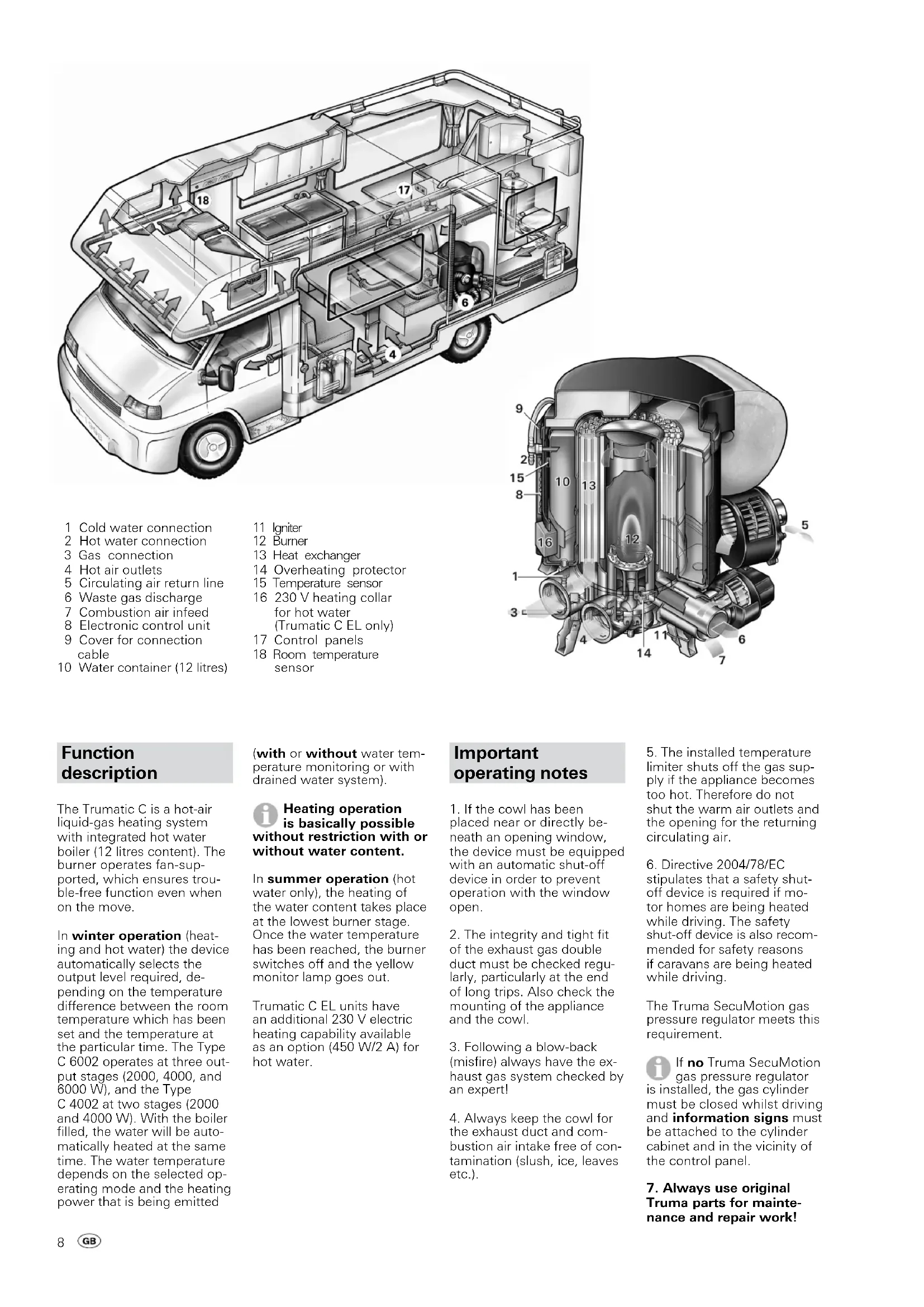 Any modifications to the unit (including the exhaust duct and the cowl) or the use of spare parts and acces- sories that are important to the operation of the system (e.g. the time switch) that are not original Truma parts and failure to follow the installa- tion and operating instruc- tions will cancel the warranty and indemnify Truma from any liability claims. It also becomes illegal to use the appliance, and in some coun- tries this even makes it illegal to use the vehicle.