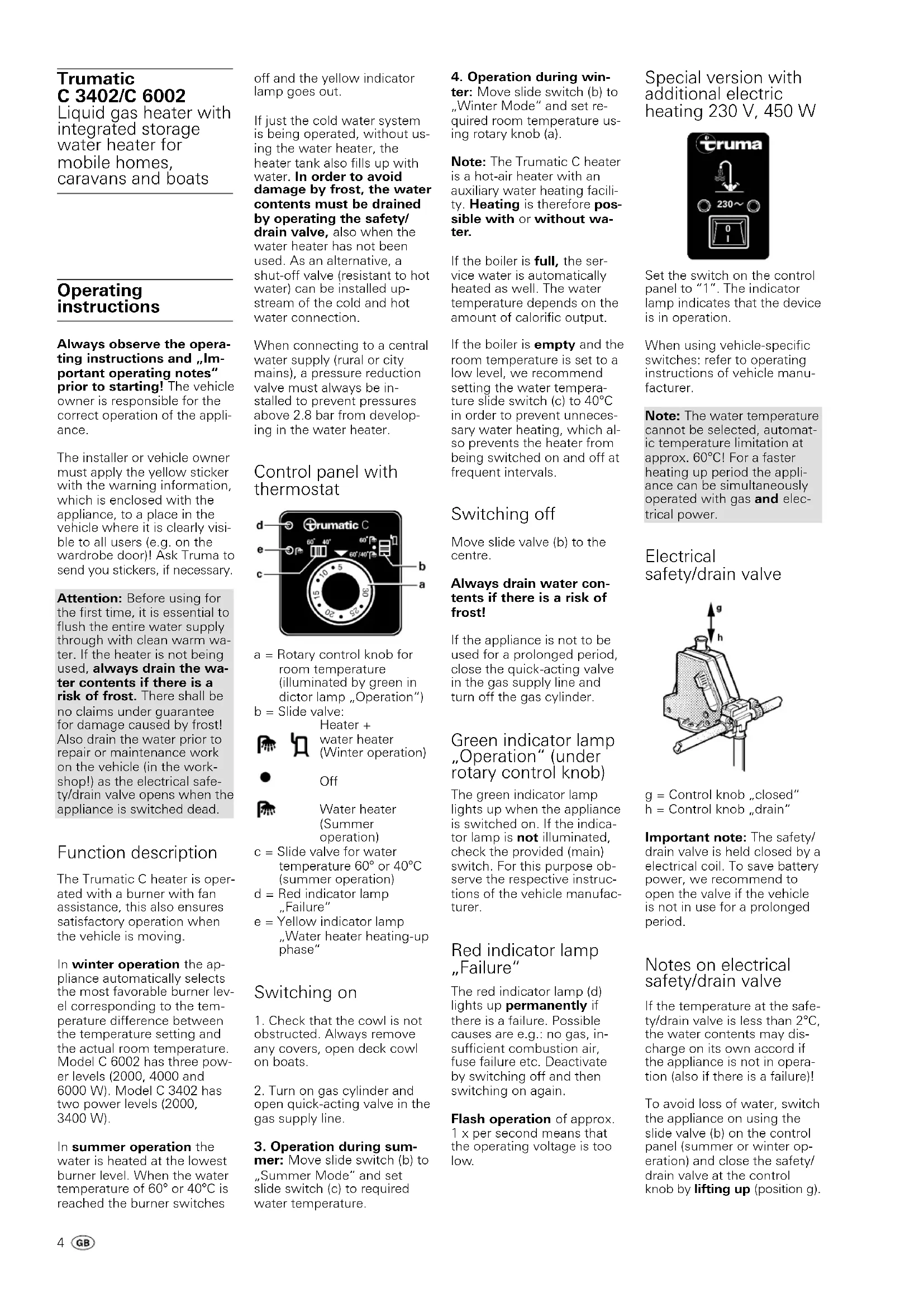 ter: Move slide switch (b) to „Winter Mode“ and set re- quired room temperature us- ing rotary knob (a). Note: The Trumatic C heater is a hot-air heater with an auxiliary water heating facili- ty. Heating is therefore pos- sible with or without wa- ter. If the boiler is full, the ser- vice water is automatically heated as well. The water temperature depends on the amount of calorific output. If the boiler is empty and the room temperature is set to a low level, we recommend setting the water tempera- ture slide switch (c) to 40°C in order to prevent unneces- sary water heating, which al- so prevents the heater from being switched on and off at frequent intervals. Switching off Move slide valve (b) to the centre. Always drain water con- tents if there is a risk of frost! If the appliance is not to be used for a prolonged period, close the quick-acting valve in the gas supply line and turn off the gas cylinder. Green indicator lamp „Operation“ (under rotary control knob) The green indicator lamp lights up when the appliance is switched on. If the indica- tor lamp is not illuminated, check the provided (main) switch. For this purpose ob- serve the respective instruc- tions of the vehicle manufac- turer. Red indicator lamp „Failure“ The red indicator lamp (d) lights up permanently if there is a failure. Possible causes are e.g.: no gas, in- sufficient combustion air, fuse failure etc. Deactivate by switching off and then switching on again. Flash operation of approx. 1 x per second means that the operating voltage is too low.Attention: Without heater operation, the safety/drain valve can only be closed again at temperatures above 8°C! Filling the boiler