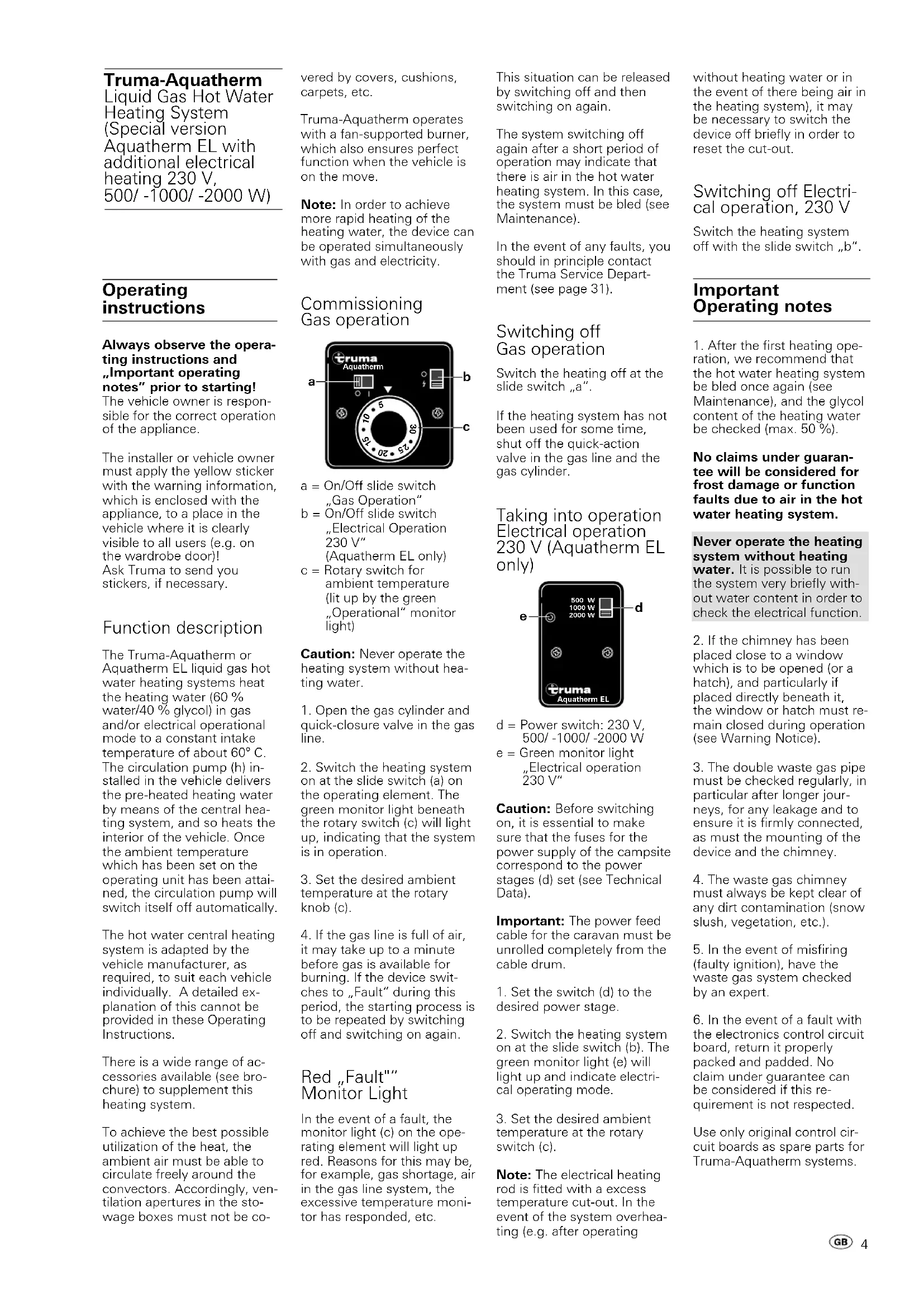 This situation can be released by switching off and then switching on again. The system switching off again after a short period of operation may indicate that there is air in the hot water heating system. In this case, the system must be bled (see Maintenance). In the event of any faults, you should in principle contact the Truma Service Depart- ment (see page 31). Switching off Gas operation Switch the heating off at the slide switch „a“. If the heating system has not been used for some time, shut off the quick-action valve in the gas line and the gas cylinder. Taking into operation Electrical operation 230 V (Aquatherm EL only) d = Power switch: 230 V, 500/ -1000/ -2000 W e = Green monitor light „Electrical operation 230 V“ Caution: Before switching on, it is essential to make sure that the fuses for the power supply of the campsite correspond to the power stages (d) set (see Technical Data). Important: The power feed cable for the caravan must be unrolled completely from the cable drum.
