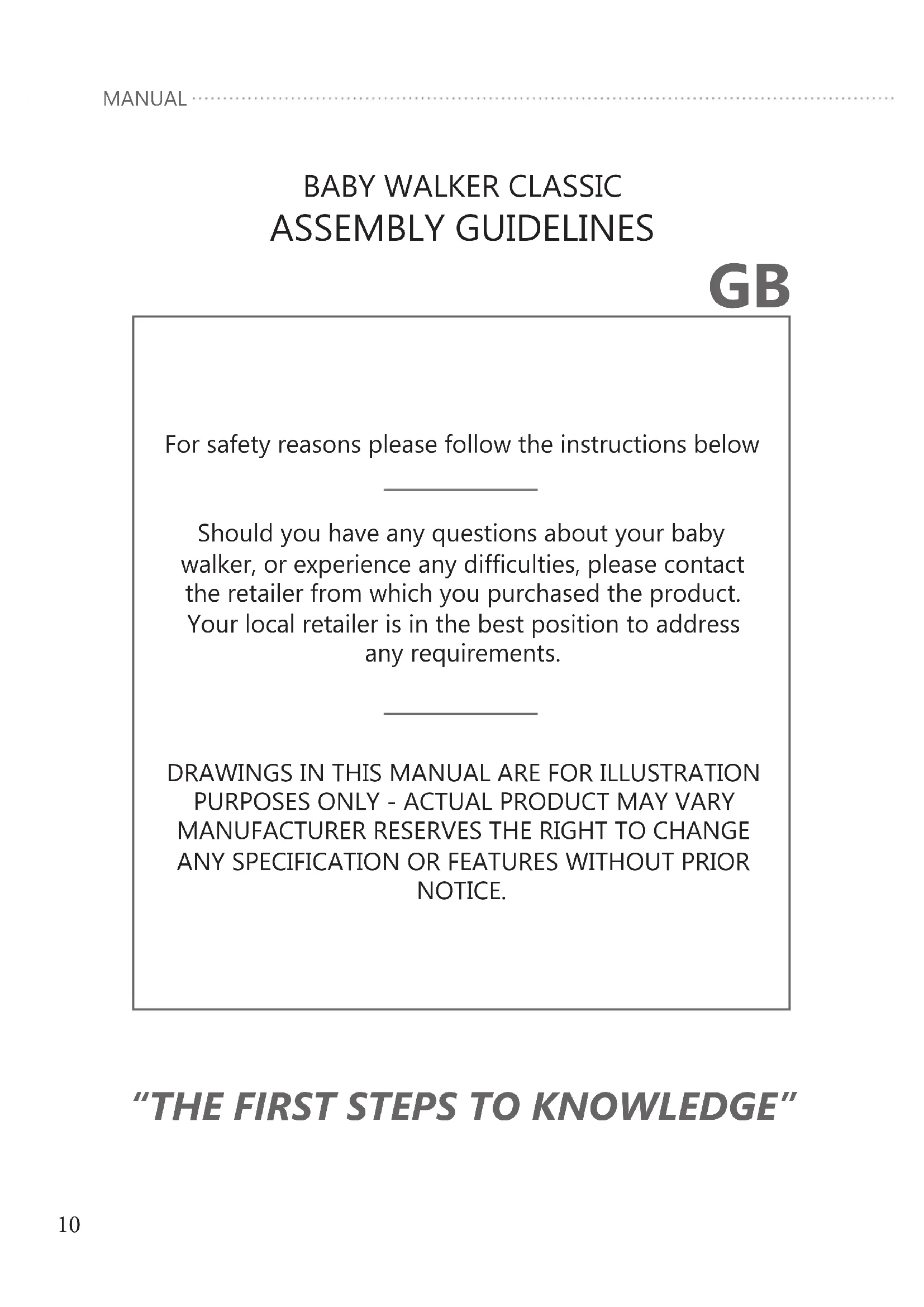 Should you have any questions about your baby walker, or experience any difficulties, please contact the retailer from which you purchased the product. Your local retailer is in the best position to address any requirements.