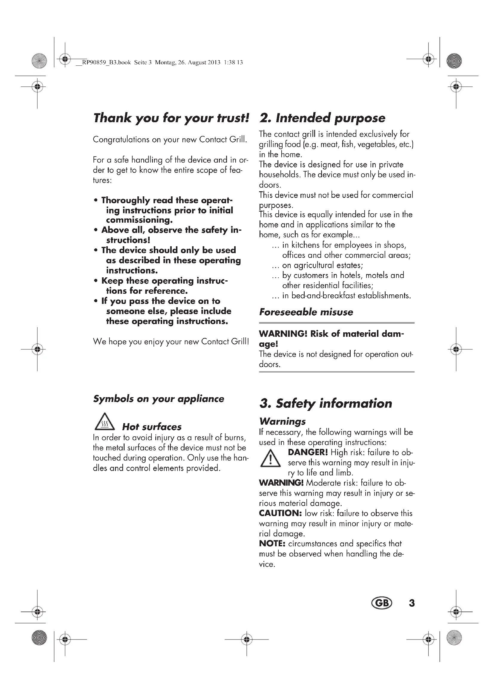 The contact grill is intended exclusively for grilling food (e.g. meat, fish, vegetables, etc.) in the home. The device is designed for use in private households. The device must only be used in- doors. This device must not be used for commercial purposes. This device is equally intended for use in the home and in applications similar to the home, such as for example... … in kitchens for employees in shops, offices and other commercial areas; … on agricultural estates; … by customers in hotels, motels and other residential facilities; … in bed-and-breakfast establishments. Foreseeable misuse WARNING! Risk of material dam- age! The device is not designed for operation out- doors.