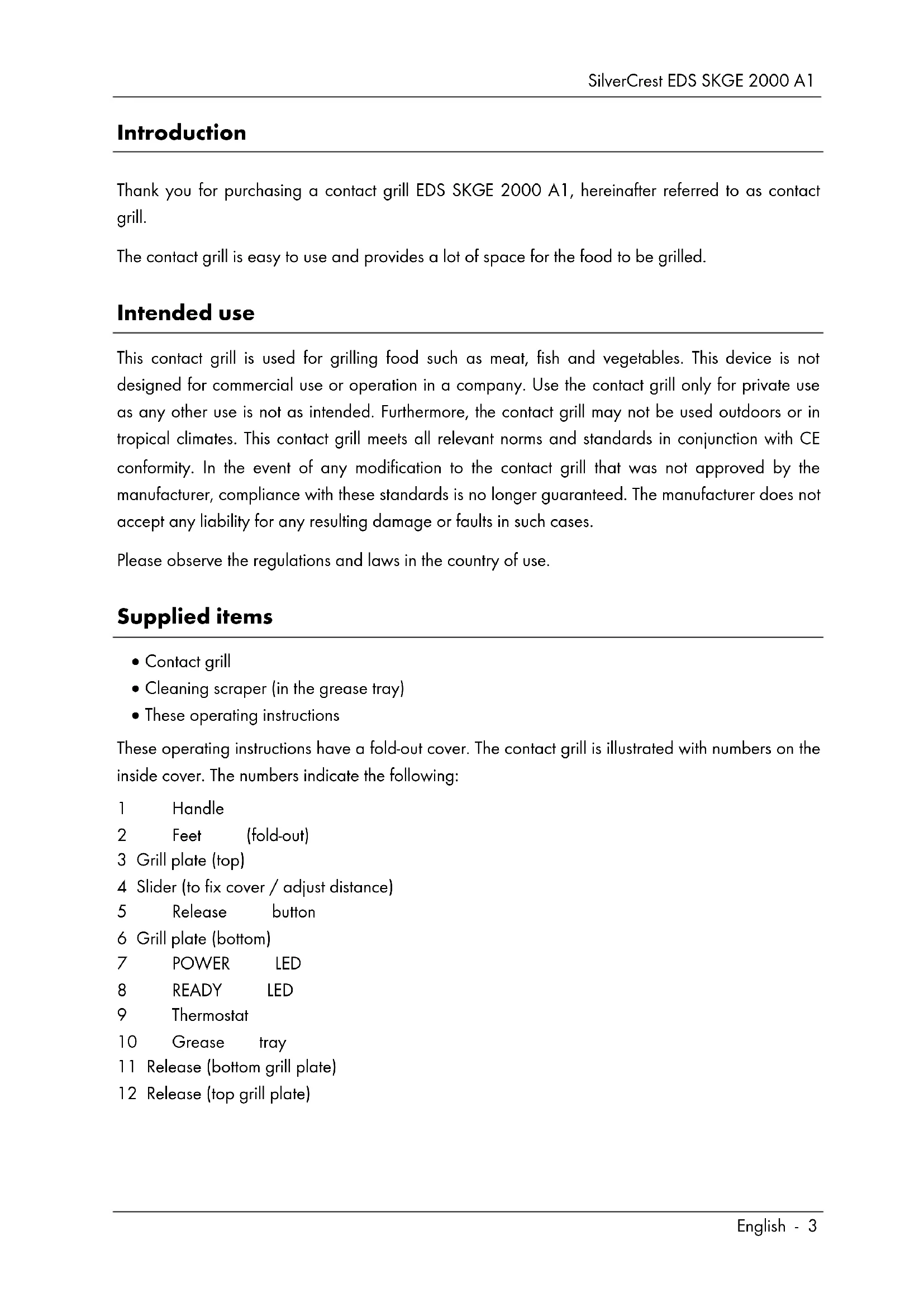 Mains cable Always handle the mains cable by the mains plug and do not pull on the cable itself. Do not place the contact grill, furniture or other heavy objects on the mains cable and ensure that it is not kinked. Never tie a knot in the mains cable and do not tie cables together. Ensure that the mains cable is placed so that no one can trip over it and it does not cause an obstruction. Make sure that the mains cable does not touch any hot surfaces of the contact grill. Do not use adapter plugs or extension cables that do not comply with applicable safety standards, and do not make any alterations to the mains cable! If the mains cable is damaged, it must be replaced by the manufacturer or its customer service representative or a similarly qualified person to prevent any safety hazards. Copyright All information contained in these instructions is subject to copyright and is provided for information purposes only. It is only permitted to copy or duplicate data and information with the express and written consent of the author. This also includes commercial use of the content and data. The text and illustrations are based on the state of the art at the time of printing. Subject to change. Prior to use Remove the contact grill from the packaging and remove the packaging material completely. Check the contact grill for signs of damage. If damaged, the contact grill must not be used. Place the contact grill on a flat, heat-resistant surface. If the surface is sensitive, place a heat- resistant board under the contact grill. There is a risk of burns! The temperature of the accessible surfaces may be very high when the device is operating. Clean the contact grill as described in the section "Cleaning". Remove the cleaning scraper from the grease tray (10). Turn the thermostat (9) to "●". Open the cover and lightly grease the grill plates (3 and 6) with suitable grease, margarine or oil. This enables production-related residue on the grill plates (3 and 6) to be removed more easily. Then insert the mains plug into a mains socket that is always easily accessible. Turn the thermostat (9) to "MAX" and preheat the contact grill once with the cover open until the READY LED (8) lights up to indicate that the temperature has been reached. When using the device for the first time, production-related residue may give rise to a slight odour and minor smoke emission is also possible. This is normal and will fade after a short time. Please ensure that there is sufficient ventilation. Open a window if necessary. After approximately 15SilverCrest EDS SKGE 2000 A1 English - 7 minutes, turn the thermostat (9) to "●" in order to switch off the contact grill. Now disconnect the mains plug from the socket and let the contact grill cool down. Then clean the contact grill again as described in the section "Cleaning". First use Place the contact grill on a flat, heat-resistant surface. If the surface is sensitive, place a heat- resistant board under the contact grill. There is a risk of burns! The temperature of the accessible surfaces may be very high when the device is operating. Only touch the handle (1) or the thermostat (9) of the contact grill. The accessible surfaces of the contact grill can become very hot. Use pot holders or oven gloves to prevent burns. There is a risk of injury. Never use metallic objects to remove or turn food that you are grilling as they can damage the coating of the grill plates (3 and 6). Use a heat-resistant plastic or wooden spatula instead. Place the food to be grilled directly on the grill plates (3 and 6). Never use tin foil, a plate or similar as a base. Before using the contact grill for the first time, make sure that the grease tray (10) is correctly inserted. The grease tray (10) must be emptied in time to prevent it from overflowing. Optimising outward flow of grease There are 2 fold-out feet (see arrows in the adjoining figure) at the rear of the bottom grill plate (6). Fold them out when you are preparing food with a high fat content. This raises the front of the unit slightly and allows the resulting grease to flow more easily into the grease tray (10). In "single-sided grilling" mode, you can place the the top grill plate (3) slightly at an angle with light pressure (see arrow) to ensure the grease flows easily.SilverCrest EDS SKGE 2000 A1
