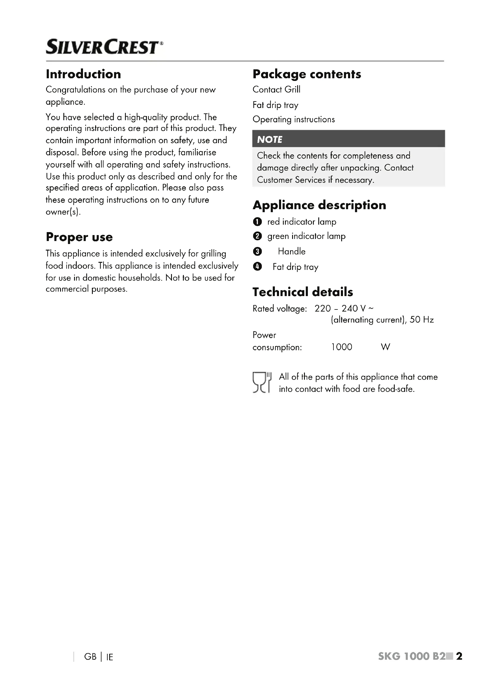 Introduction Congratulations on the purchase of your new appliance. You have selected a high-quality product. The operating instructions are part of this product. They contain important information on safety, use and disposal. Before using the product, familiarise yourself with all operating and safety instructions. Use this product only as described and only for the specified areas of application. Please also pass these operating instructions on to any future owner(s). Proper use This appliance is intended exclusively for grilling food indoors. This appliance is intended exclusively for use in domestic households. Not to be used for commercial purposes. Package contents Contact Grill Fat drip tray Operating instructions NOTE Check the contents for completeness and damage directly after unpacking. Contact Customer Services if necessary. Appliance description 1 red indicator lamp 2 green indicator lamp 3 Handle