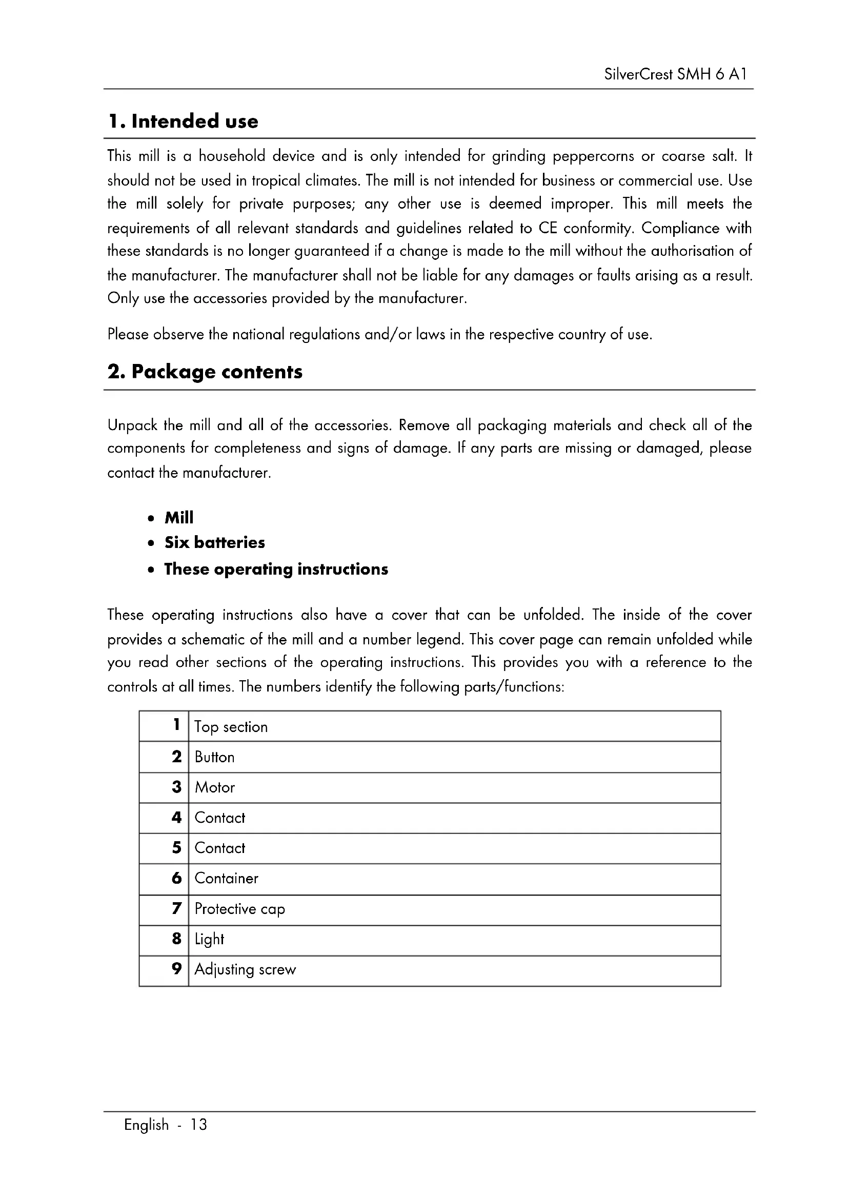 Congratulations! By purchasing the SilverCrest SMH 6 A1 electric salt or pepper mill, hereinafter referred to as mill, you have opted for a high-quality product. Familiarise yourself with the mill before using it for the first time and read these operating instructions carefully. Observe the safety instructions and only use the mill in the manner described in these operating instructions and for the indicated fields of application. Keep these operating instructions in a safe place. Hand over all documents in the event that you pass on the mill to a third party. These operating instructions are part of the product.SilverCrest SMH 6 A1 English - 13