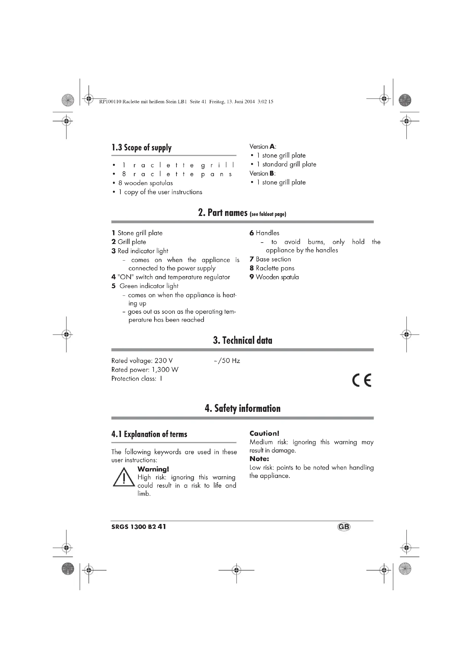 The following keywords are used in these user instructions: Warning! High risk: ignoring this warning could result in a risk to life and limb. Caution! Medium risk: ignoring this warning may result in damage. Note: Low risk: points to be noted when handling the appliance. RP100110 Raclette mit heißem Stein LB1 Seite 41 Freitag, 13. Juni 2014 3:02 1542