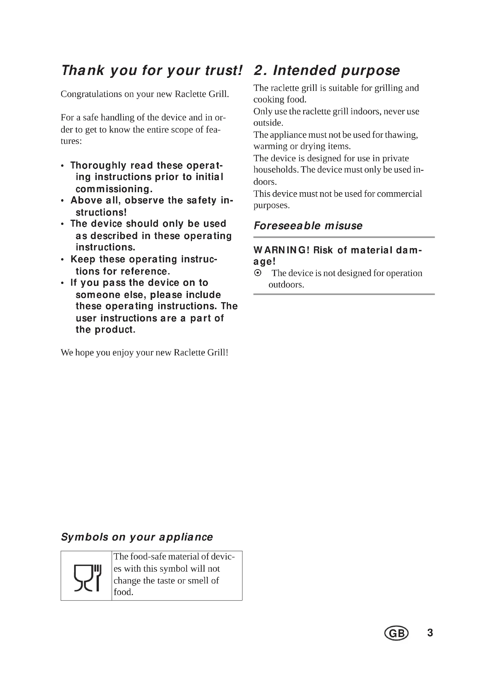 The raclette grill is suitable for grilling and cooking food. Only use the raclette grill indoors, never use outside. The appliance must not be used for thawing, warming or drying items. The device is designed for use in private households. The device must only be used in- doors. This device must not be used for commercial purposes. Foreseeable misuse WARNING! Risk of material dam- age! ~ The device is not designed for operation outdoors. The food-safe material of devic- es with this symbol will not change the taste or smell of food.4