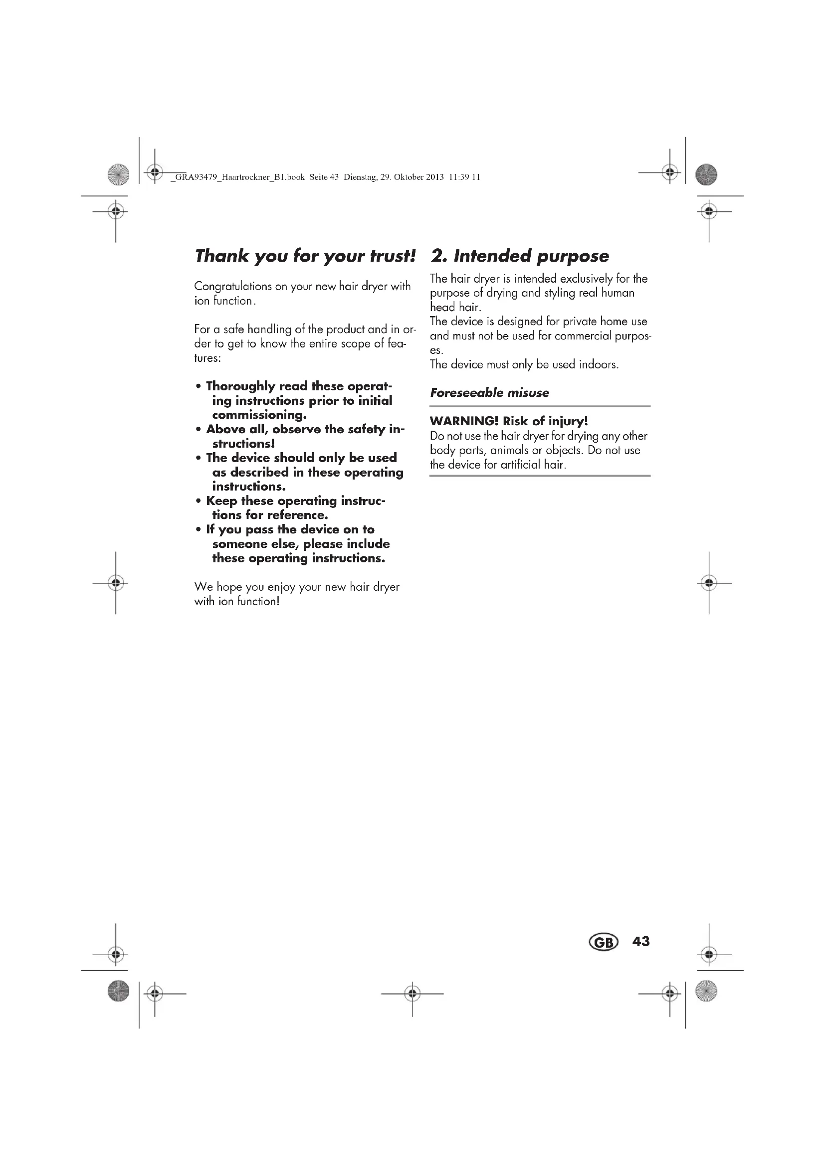 The hair dryer is intended exclusively for the purpose of drying and styling real human head hair. The device is designed for private home use and must not be used for commercial purpos- es. The device must only be used indoors. Foreseeable misuse WARNING! Risk of injury! Do not use the hair dryer for drying any other body parts, animals or objects. Do not use the device for artificial hair. _GRA93479_Haartrockner_B1.book Seite 43 Dienstag, 29. Oktober 2013 11:39 1144