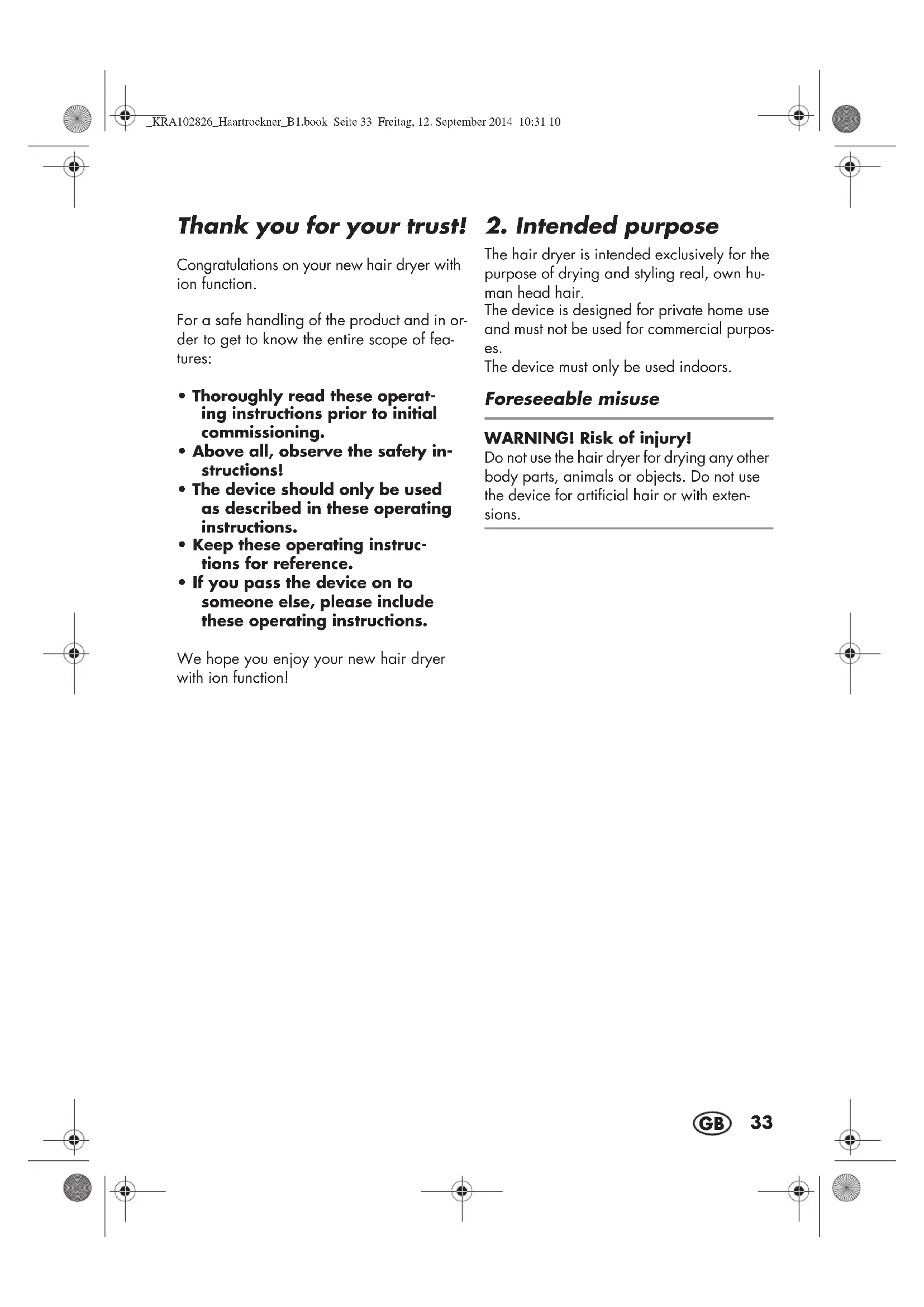 The hair dryer is intended exclusively for the purpose of drying and styling real, own hu- man head hair. The device is designed for private home use and must not be used for commercial purpos- es. The device must only be used indoors. Foreseeable misuse WARNING! Risk of injury! Do not use the hair dryer for drying any other body parts, animals or objects. Do not use the device for artificial hair or with exten- sions. _KRA102826_Haartrockner_B1.book Seite 33 Freitag, 12. September 2014 10:31 1034