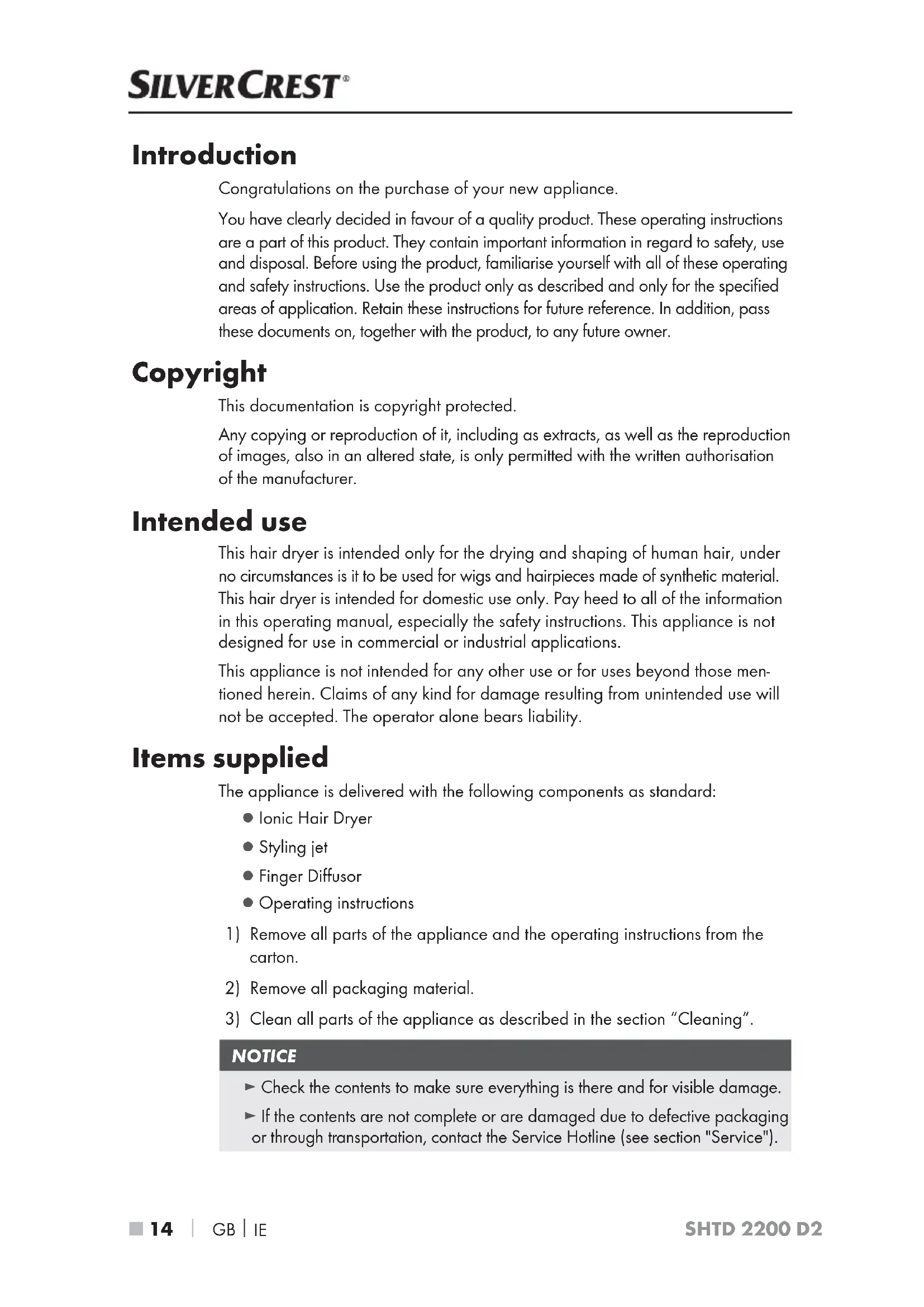 SHTD 2200 D2 Introduction Congratulations on the purchase of your new appliance. You have clearly decided in favour of a quality product. These operating instructions are a part of this product. They contain important information in regard to safety, use and disposal. Before using the product, familiarise yourself with all of these operating and safety instructions. Use the product only as described and only for the specified areas of application. Retain these instructions for future reference. In addition, pass these documents on, together with the product, to any future owner. Copyright This documentation is copyright protected. Any copying or reproduction of it, including as extracts, as well as the reproduction of images, also in an altered state, is only permitted with the written authorisation of the manufacturer. Intended use This hair dryer is intended only for the drying and shaping of human hair, under no circumstances is it to be used for wigs and hairpieces made of synthetic material. This hair dryer is intended for domestic use only. Pay heed to all of the information in this operating manual, especially the safety instructions. This appliance is not designed for use in commercial or industrial applications. This appliance is not intended for any other use or for uses beyond those men- tioned herein. Claims of any kind for damage resulting from unintended use will not be accepted. The operator alone bears liability. Items supplied The appliance is delivered with the following components as standard: ▯ Ionic Hair Dryer ▯ Styling jet ▯ Finger Diffusor ▯ Operating instructions