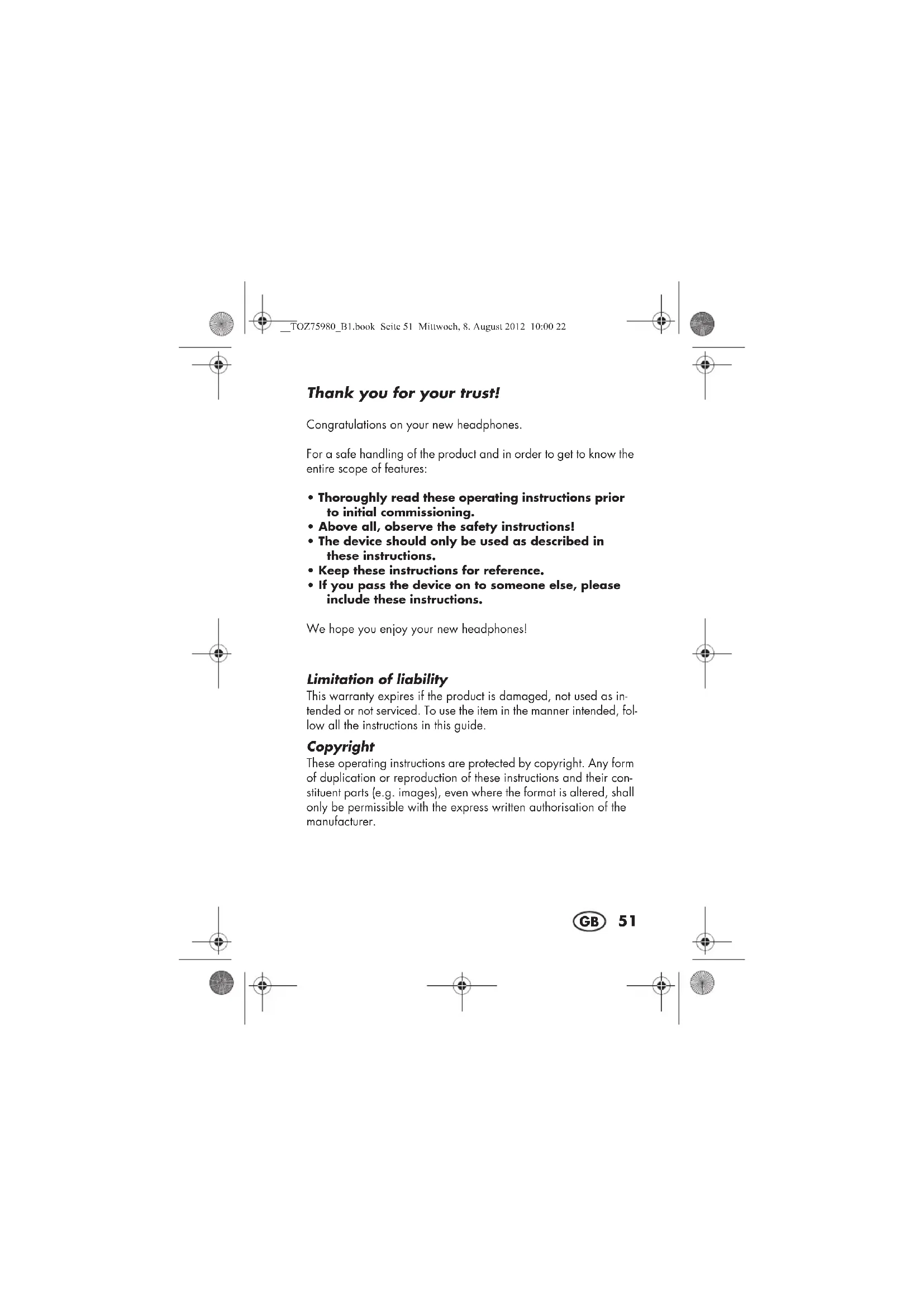 - If you pass the device on to someone else, please include these instructions. We hope you enjoy your new headphones! Limitation of liability This warranty expires if the product is damaged, not used as in- tended or not serviced. To use the item in the manner intended, fol- low all the instructions in this guide. Copyright These operating instructions are protected by copyright. Any form of duplication or reproduction of these instructions and their con- stituent parts (e.g. images), even where the format is altered, shall only be permissible with the express written authorisation of the manufacturer. __TOZ75980_B1.book Seite 51 Mittwoch, 8. August 2012 10:00 2252