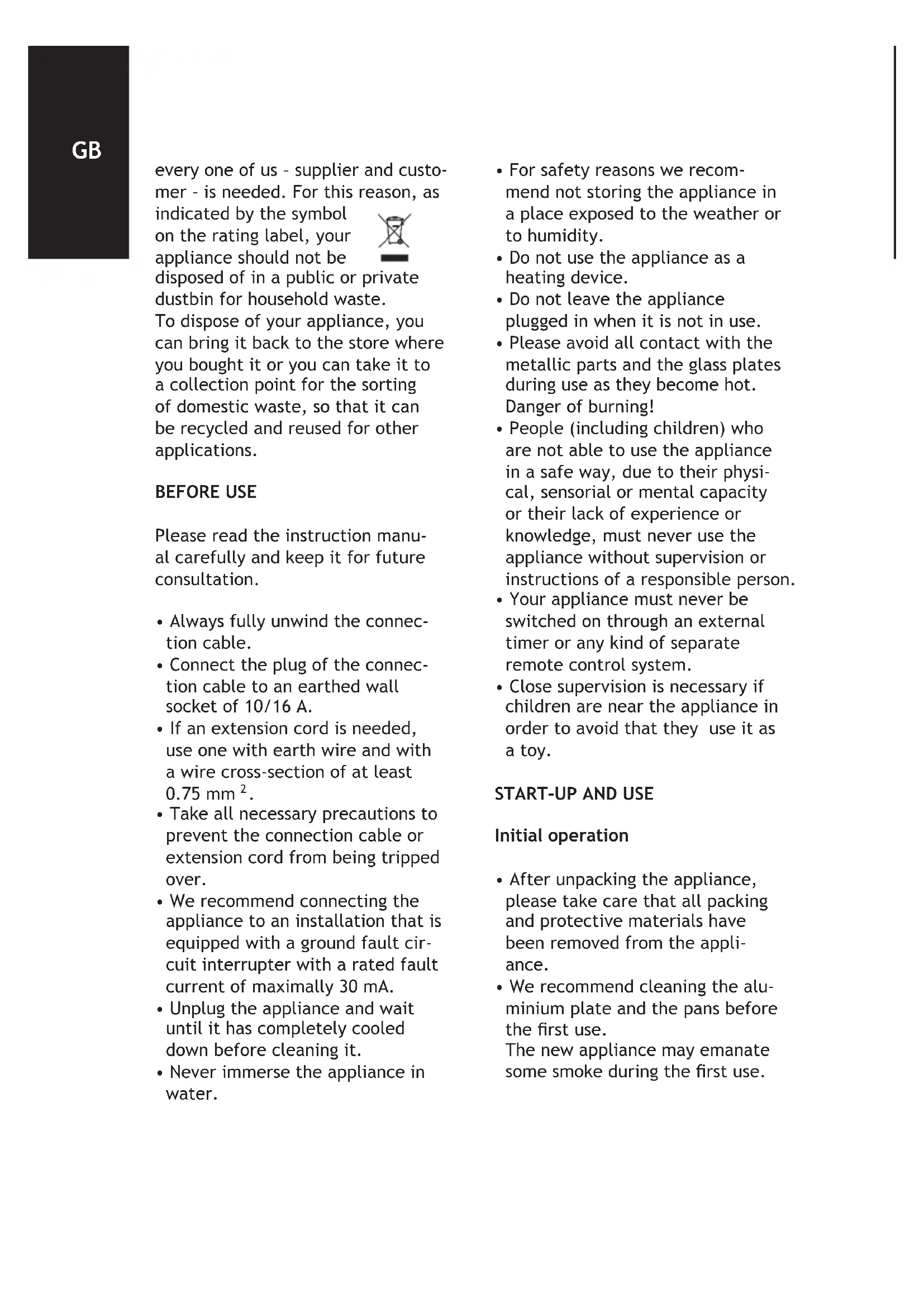 - Please avoid all contact with the metallic parts and the glass plates during use as they become hot. Danger of burning!