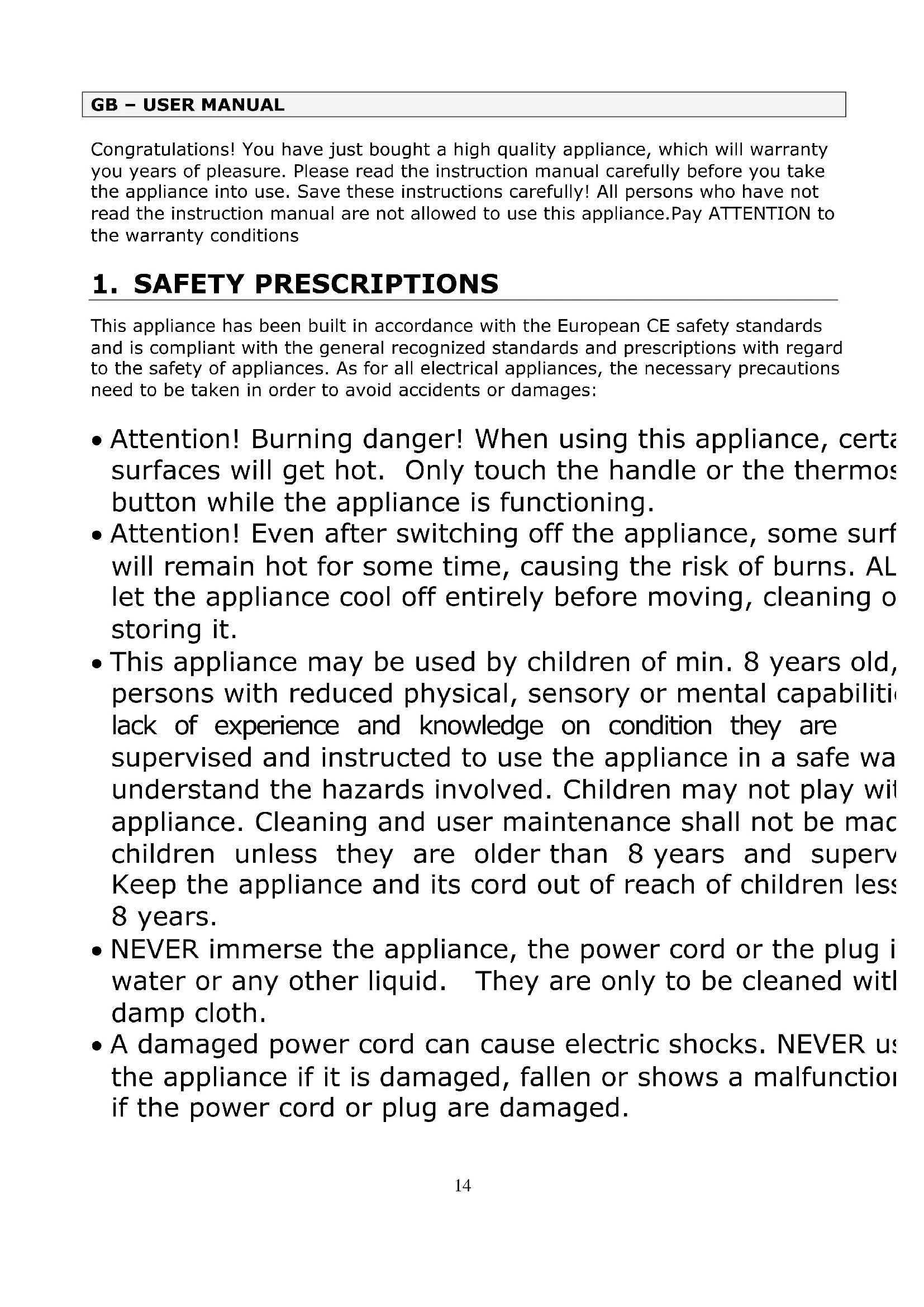 This appliance has been built in accordance with the European CE safety standards and is compliant with the general recognized standards and prescriptions with regard to the safety of appliances. As for all electrical appliances, the necessary precautions need to be taken in order to avoid accidents or damages: Attention! Burning danger! When using this appliance, certain surfaces will get hot. Only touch the handle or the thermostat button while the appliance is functioning. Attention! Even after switching off the appliance, some surfaces will remain hot for some time, causing the risk of burns. ALWAYS let the appliance cool off entirely before moving, cleaning or storing it. This appliance may be used by children of min. 8 years old, by persons with reduced physical, sensory or mental capabilities or lack of experience and knowledge on condition they are supervised and instructed to use the appliance in a safe way and understand the hazards involved. Children may not play with the appliance. Cleaning and user maintenance shall not be made by children unless they are older than 8 years and supervised. Keep the appliance and its cord out of reach of children less than 8 years. NEVER immerse the appliance, the power cord or the plug in water or any other liquid. They are only to be cleaned with a damp cloth. A damaged power cord can cause electric shocks. NEVER use the appliance if it is damaged, fallen or shows a malfunction, or if the power cord or plug are damaged.15 In all these cases return the appliance to your sales point or recognized after sales service. NEVER use separate timers or remote control systems. ALWAYS place the appliance on a solid and flat base, such as a kitchen counter or table, so that the appliance won’t move or turn over. After use remove the plug from the power point. Also proceed this way when the appliance is not in use, before cleaning and moving. NEVER use the appliance outdoor. NEVER use extension cords or sockets. Place the appliance near a power point and connect it directly. ALWAYS complete unroll the power cord. NEVER let the cord hang over the edge of the table or the counter. NEVER place the power supply cord near heat sources such as cookers, heatings or ovens. Only use the appliance on the mains voltage as indicated on the identification label. This appliance is only suited for indoor household use, and not for professional use.
