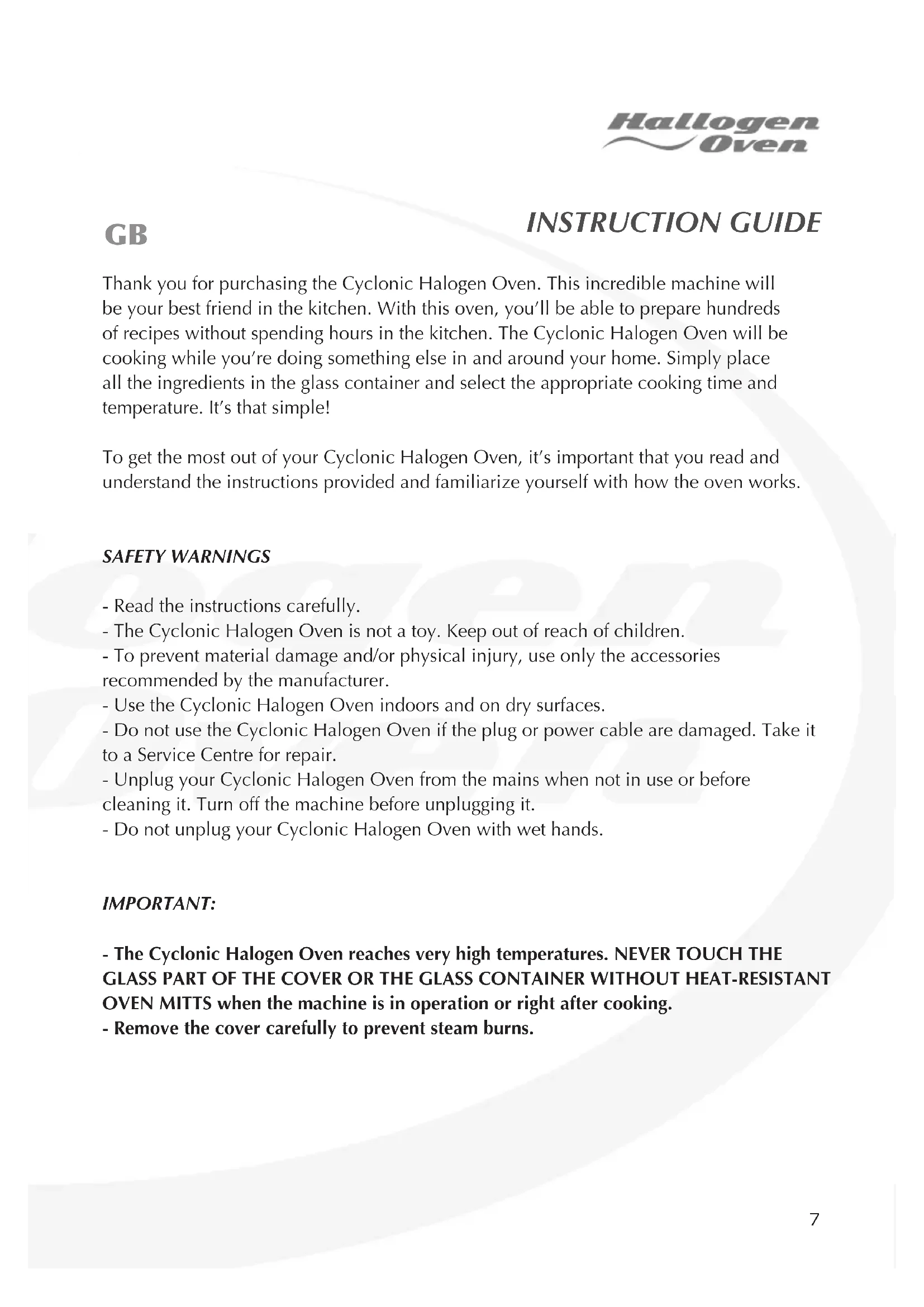 Le symbole de conteneur sur roues barré indique que vous devez respecter la législation locale en matière de déchets pour ce type de produits. N’éliminez pas ce produit de la même manière que des ordures ménagères courantes. Éliminez-les conformément à la législation locale correspondante. Les produits électriques et électroniques renferment des substances dangereuses nuisibles à l’environnement et à la santé de l’Homme et ils doivent être recyclés en conséquence. FR7 INSTRUCTION GUIDE Thank you for purchasing the Cyclonic Halogen Oven. This incredible machine will be your best friend in the kitchen. With this oven, you’ll be able to prepare hundreds of recipes without spending hours in the kitchen. The Cyclonic Halogen Oven will be cooking while you’re doing something else in and around your home. Simply place all the ingredients in the glass container and select the appropriate cooking time and temperature. It’s that simple! To get the most out of your Cyclonic Halogen Oven, it’s important that you read and understand the instructions provided and familiarize yourself with how the oven works. SAFETY WARNINGS - Read the instructions carefully. - The Cyclonic Halogen Oven is not a toy. Keep out of reach of children. - To prevent material damage and/or physical injury, use only the accessories recommended by the manufacturer. - Use the Cyclonic Halogen Oven indoors and on dry surfaces. - Do not use the Cyclonic Halogen Oven if the plug or power cable are damaged. Take it to a Service Centre for repair. - Unplug your Cyclonic Halogen Oven from the mains when not in use or before cleaning it. Turn off the machine before unplugging it. - Do not unplug your Cyclonic Halogen Oven with wet hands. IMPORTANT: - The Cyclonic Halogen Oven reaches very high temperatures. NEVER TOUCH THE GLASS PART OF THE COVER OR THE GLASS CONTAINER WITHOUT HEAT-RESISTANT OVEN MITTS when the machine is in operation or right after cooking. - Remove the cover carefully to prevent steam burns. GB8 The Cyclonic Halogen Oven is a real cooking revolution. With this oven, you’ll be able to roast, bake, brown, heat and defrost your food in record time. You’ll be able to cook meat, sh, vegetables and other foods. The Cyclonic Halogen Oven is widely used by professionals. One of its main features is its heat-circulating system, which enables fast, even cooking that uses less energy. - Before using your Cyclonic Halogen Oven for the rst time, let it operate empty for 10 minutes at 200°C. - Do not worry if you notice a burning smell, as this is completely normal. - Clean the inside of the glass container with a damp sponge or cloth. Make sure that the surface is clean. - Place the stainless-steel tray under the glass container and put the ingredients inside. - Place the cover on the glass container and make sure that the edges t together. - Plug the oven into the mains. - As a safety feature, the device will not function unless the handle on top of the cover is down. - Set the timer to the desired cooking time. - Set the thermostat to the desired temperature. Consult the following table for the appropriate cooking times and temperatures for different kinds of food: