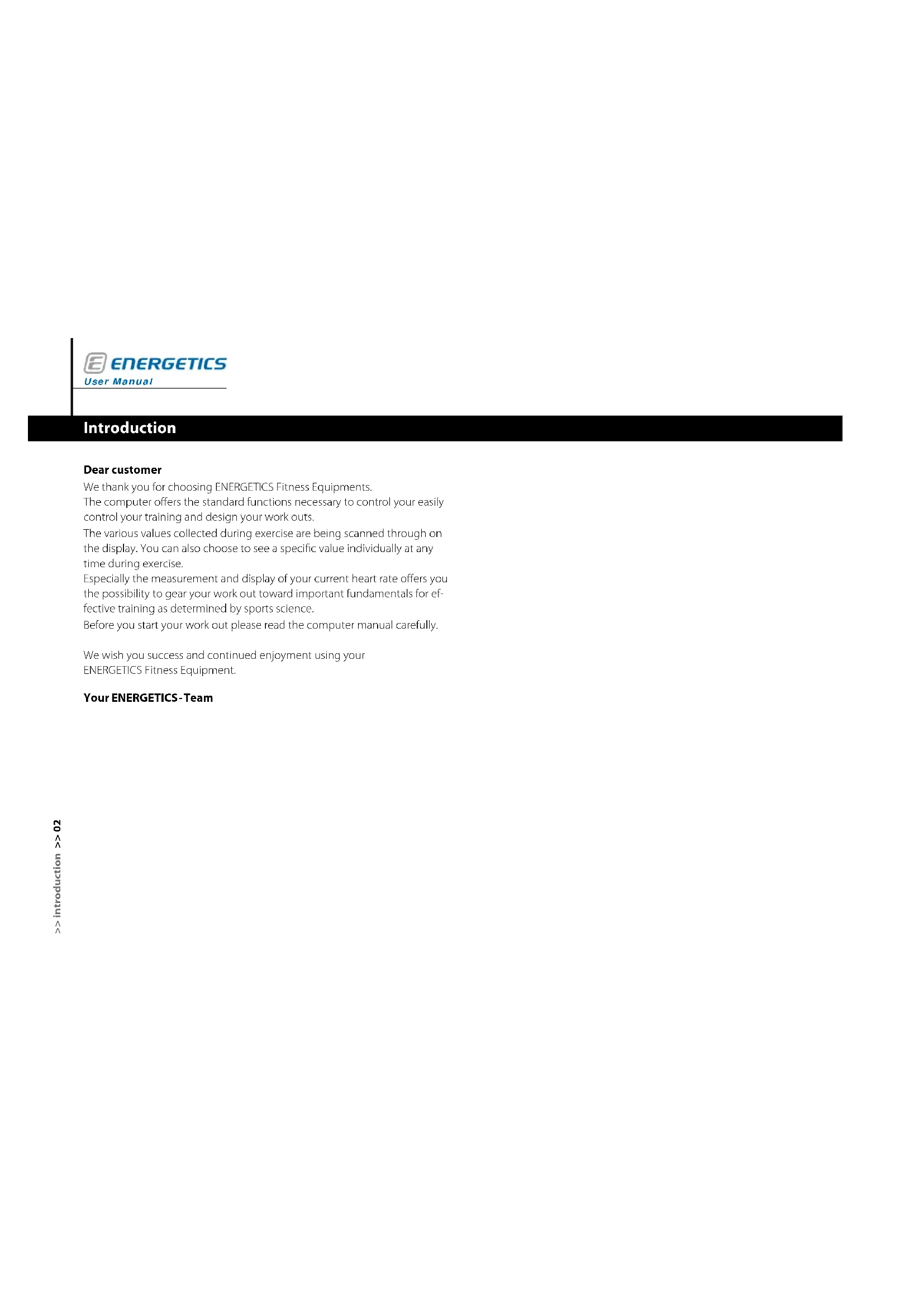 - Maintenance >> content >> 01 User Manual E-202User Manual >> introduction >> 02 Introduction Dear customer We thank you for choosing ENERGETICS Fitness Equipments. The computer offers the standard functions necessary to control your easily control your training and design your work outs. The various values collected during exercise are being scanned through on the display. You can also choose to see a specific value individually at any time during exercise. Especially the measurement and display of your current heart rate offers you the possibility to gear your work out toward important fundamentals for ef- fective training as determined by sports science. Before you start your work out please read the computer manual carefully. We wish you success and continued enjoyment using your ENERGETICS Fitness Equipment. Your ENERGETICS - TeamEN >> legend >> 03 The display and it’s symbols (D1) Main Display – scanning through various settings and important values (D2) STOP – data collection interrupted, no activity (D3) blinking: transmission of heart rate active (D4) SCAN – data collection active (D5) TIME – training session (minutes) (D6) SP – speed (kilometre/hour) (D7) RPM – cadence (pedal revolutions/minute) (D8) DIST – distance covered in kilometres (D9) CAL – calories used measured in kilojoules (D10) ODO – total distance in kilometres (D11) PULSE – current heart rate in beats per minute (D12) K – unit used for measurement (kilometre) or kilometre/hour The computer housing Front (C1) Display – shows all important measured and calculated values and functions (C2) MODE – scans through a variety of display functions during the work out (C3) SET – confirm the selection of a program or value (C4) RESET p. 13