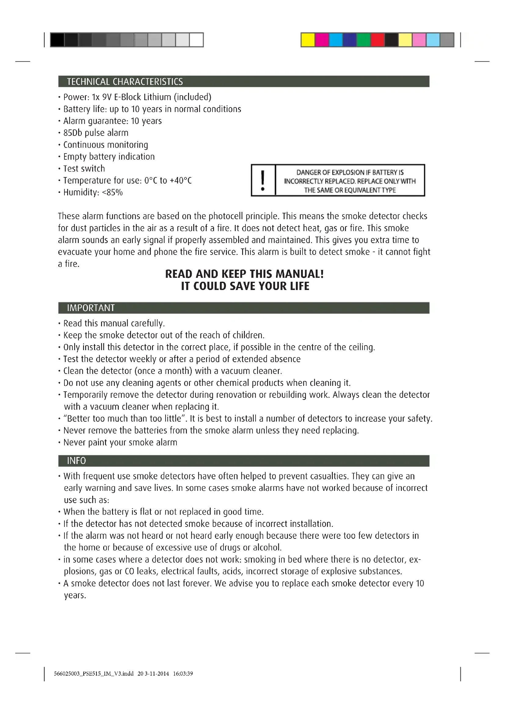 "Better too much than too little". It is best to install a number of detectors to increase your safety. - Never remove the batteries from the smoke alarm unless they need replacing.
