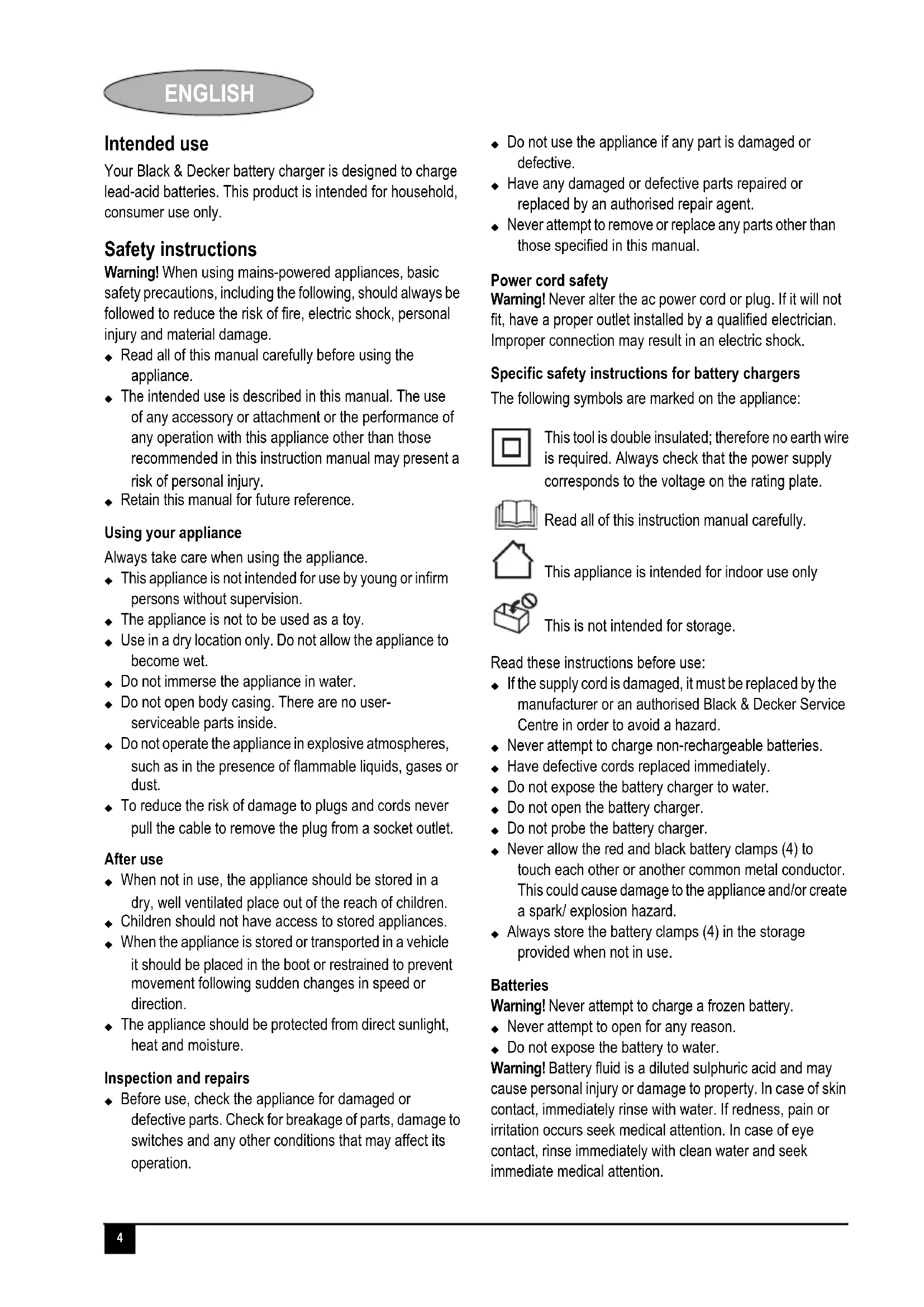 Your Black & Decker battery charger is designed to charge lead-acid batteries. This product is intended for household, consumer use only.