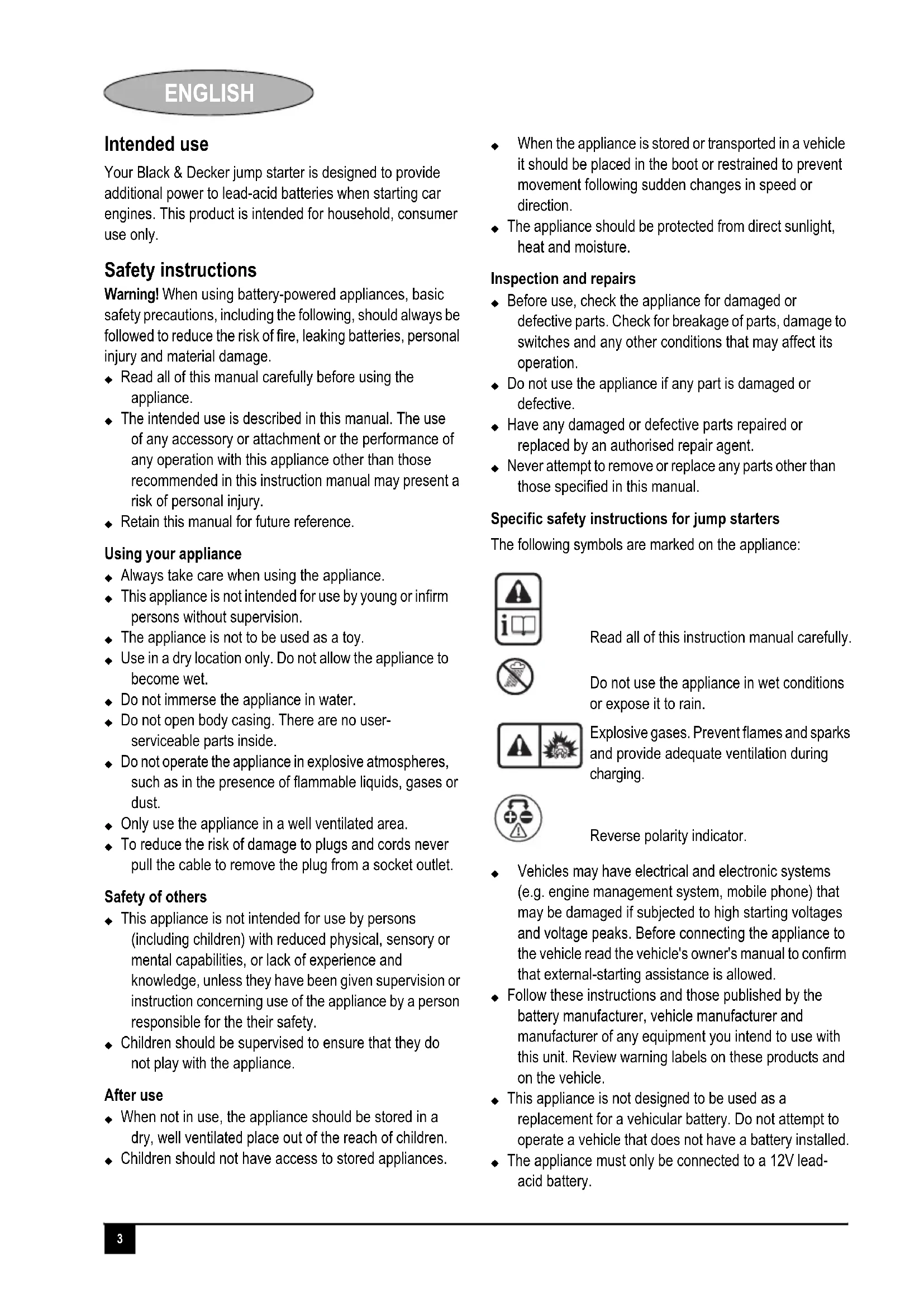 ENGLISH ENGLISH Intended use Your Black & Decker jump starter is designed to provide additional power to lead-acid batteries when starting car engines. This product is intended for household, consumer use only. Safety instructions Warning! When using battery-powered appliances, basic safety precautions, including the following, should always be followed to reduce the risk of fire, leaking batteries, personal injury and material damage. X Read all of this manual carefully before using the appliance. X The intended use is described in this manual. The use of any accessory or attachment or the performance of any operation with this appliance other than those recommended in this instruction manual may present a risk of personal injury. X Retain this manual for future reference. Using your appliance X Always take care when using the appliance. X This appliance is not intended for use by young or infirm persons without supervision. X The appliance is not to be used as a toy. X Use in a dry location only. Do not allow the appliance to become wet. X Do not immerse the appliance in water. X Do not open body casing. There are no user- serviceable parts inside. X Do not operate the appliance in explosive atmospheres, such as in the presence of flammable liquids, gases or dust. X Only use the appliance in a well ventilated area. X To reduce the risk of damage to plugs and cords never pull the cable to remove the plug from a socket outlet. Safety of others X This appliance is not intended for use by persons (including children) with reduced physical, sensory or mental capabilities, or lack of experience and knowledge, unless they have been given supervision or instruction concerning use of the appliance by a person responsible for the their safety. X Children should be supervised to ensure that they do not play with the appliance. After use X When not in use, the appliance should be stored in a dry, well ventilated place out of the reach of children. X Children should not have access to stored appliances. X When the appliance is stored or transported in a vehicle it should be placed in the boot or restrained to prevent movement following sudden changes in speed or direction. X The appliance should be protected from direct sunlight, heat and moisture. Inspection and repairs X Before use, check the appliance for damaged or defective parts. Check for breakage of parts, damage to switches and any other conditions that may affect its operation. X Do not use the appliance if any part is damaged or defective. X Have any damaged or defective parts repaired or replaced by an authorised repair agent. X Never attempt to remove or replace any parts other than those specified in this manual. Specific safety instructions for jump starters The following symbols are marked on the appliance: X Vehicles may have electrical and electronic systems (e.g. engine management system, mobile phone) that may be damaged if subjected to high starting voltages and voltage peaks. Before connecting the appliance to the vehicle read the vehicle's owner's manual to confirm that external-starting assistance is allowed. X Follow these instructions and those published by the battery manufacturer, vehicle manufacturer and manufacturer of any equipment you intend to use with this unit. Review warning labels on these products and on the vehicle. X This appliance is not designed to be used as a replacement for a vehicular battery. Do not attempt to operate a vehicle that does not have a battery installed. X The appliance must only be connected to a 12V lead- acid battery. Read all of this instruction manual carefully. Do not use the appliance in wet conditions or expose it to rain. Explosive gases. Prevent flames and sparks and provide adequate ventilation during charging. Reverse polarity indicator.4 ENGLISH Warning! Do not use the appliance for charging dry-cell batteries that are commonly used with home appliances. These batteries may burst and cause injury to persons or damage to property. X Check the polarity of the vehicle battery terminals before connecting the appliance. Always disconnect the negative (black) jumper cable first: followed by the positive (red) jumper cable. X The ON/OFF switch should be in the OFF position before connection to a power source or load, when the unit is charging and when not in use. Warning! Never allow the red and black clamps to touch each other or another common metal conductor. This could cause damage to the appliance and/or create a sparking/ explosion hazard. Always store the battery clamps in the built-in holsters when not in use. X When using this unit in proximity to the vehicle's battery and engine, stand the unit on a flat, stable surface, and be sure to keep all clamps, cords, clothing and body parts away from moving parts of the vehicle. X This appliance contains a sealed lead-acid battery. It is recommended that the appliance is laid flat during storage, use, and recharging. Warning! Explosive gas may be vented from the lead acid batteries when charging and under extreme conditions battery leakage may occur. Ensure the area is well ventilated when conducting jump starting and charging procedures. X To reduce the risk of electric shock, disconnect the appliance from any power source before cleaning. Turning off controls without disconnecting the appliance will not reduce this risk. X Make sure the appliance is disconnected from all charging power sources before beginning the jump start procedure. Additional safety instructions for batteries and chargers Batteries X Never attempt to open for any reason.X Do not expose the battery to water.X Do not expose the battery to heat.X Do not store in locations where the temperature may exceed 40 °C. X Charge only at ambient temperatures between 10 °C and 40 °C. X Charge only using the charger provided with the appliance/tool. X When disposing of batteries, follow the instructions given in the section "Protecting the environment". X Do not damage/d