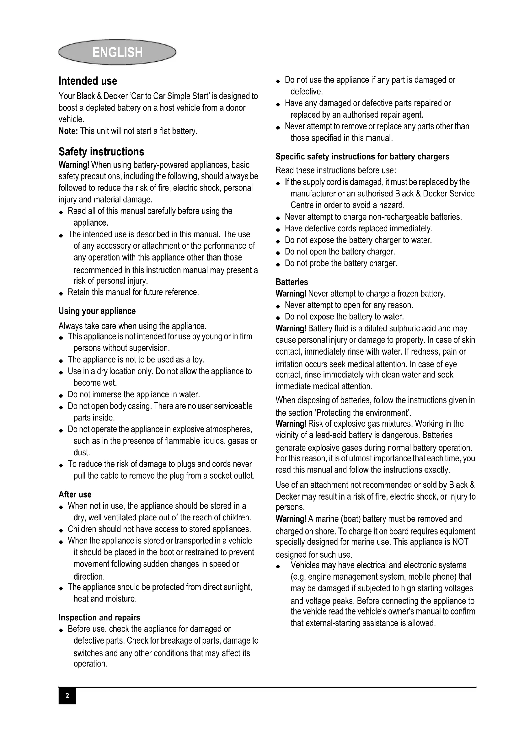 English 2 Deutsch 5 Français 9 Italiano 13 Nederlands 17 Español 21 Português 25 Svenska 29 Norsk 32 Dansk 35 Suomi 38 Ελληνικά 412 ENGLISH English Intended use Your Black & Decker ‘Car to Car Simple Start’ is designed to boost a depleted battery on a host vehicle from a donor vehicle. Note: This unit will not start a flat battery. Safety instructions Warning! When using battery-powered appliances, basic safety precautions, including the following, should always be followed to reduce the risk of fire, electric shock, personal injury and material damage. X Read all of this manual carefully before using the appliance. X The intended use is described in this manual. The use of any accessory or attachment or the performance of any operation with this appliance other than those recommended in this instruction manual may present a risk of personal injury. X Retain this manual for future reference. Using your appliance Always take care when using the appliance. X This appliance is not intended for use by young or in firm persons without supervision. X The appliance is not to be used as a toy. X Use in a dry location only. Do not allow the appliance to become wet. X Do not immerse the appliance in water. X Do not open body casing. There are no user serviceable parts inside. X Do not operate the appliance in explosive atmospheres, such as in the presence of flammable liquids, gases or dust. X To reduce the risk of damage to plugs and cords never pull the cable to remove the plug from a socket outlet. After use X When not in use, the appliance should be stored in a dry, well ventilated place out of the reach of children. X Children should not have access to stored appliances. X When the appliance is stored or transported in a vehicle it should be placed in the boot or restrained to prevent movement following sudden changes in speed or direction. X The appliance should be protected from direct sunlight, heat and moisture. Inspection and repairs X Before use, check the appliance for damaged or defective parts. Check for breakage of parts, damage to switches and any other conditions that may affect its operation. X Do not use the appliance if any part is damaged or defective. X Have any damaged or defective parts repaired or replaced by an authorised repair agent. X Never attempt to remove or replace any parts other than those specified in this manual. Specific safety instructions for battery chargers Read these instructions before use: X If the supply cord is damaged, it must be replaced by the manufacturer or an authorised Black & Decker Service Centre in order to avoid a hazard. X Never attempt to charge non-rechargeable batteries. X Have defective cords replaced immediately. X Do not expose the battery charger to water. X Do not open the battery charger. X Do not probe the battery charger. Batteries Warning! Never attempt to charge a frozen battery. X Never attempt to open for any reason. X Do not expose the battery to water. Warning! Battery fluid is a diluted sulphuric acid and may cause personal injury or damage to property. In case of skin contact, immediately rinse with water. If redness, pain or irritation occurs seek medical attention. In case of eye contact, rinse immediately with clean water and seek immediate medical attention. When disposing of batteries, follow the instructions given in the section ‘Protecting the environment’. Warning! Risk of explosive gas mixtures. Working in the vicinity of a lead-acid battery is dangerous. Batteries generate explosive gases during normal battery operation. For this reason, it is of utmost importance that each time, you read this manual and follow the instructions exactly. Use of an attachment not recommended or sold by Black & Decker may result in a risk of fire, electric shock, or injury to persons. Warning! A marine (boat) battery must be removed and charged on shore. To charge it on board requires equipment specially designed for marine use. This appliance is NOT designed for such use. X Vehicles may have electrical and electronic systems (e.g. engine management system, mobile phone) that may be damaged if subjected to high starting voltages and voltage peaks. Before connecting the appliance to the vehicle read the vehicle's owner's manual to confirm that external-starting assistance is allowed.3 ENGLISH X Follow these instructions and those published by the battery manufacturer, vehicle manufacturer and manufacturer of any equipment you intend to use with this unit. Review warning labels on these products and on the vehicle. X This appliance is not designed to be used as a replacement for a vehicular battery. Do not attempt to operate a vehicle that does not have a battery installed. X The appliance must only be connected to a 12 V lead- acid battery. Do not use the appliance for charging dry- cell batteries that are commonly used with home appliances. These batteries may burst and cause injury to persons and damage property. Warning! Explosive gas may be vented from the lead-acid batteries when charging and under extreme conditions battery leakage may occur. Make sure that the area is well ventilated when conducting jump starting and charging procedures. The following symbols are marked on the appliance: Features