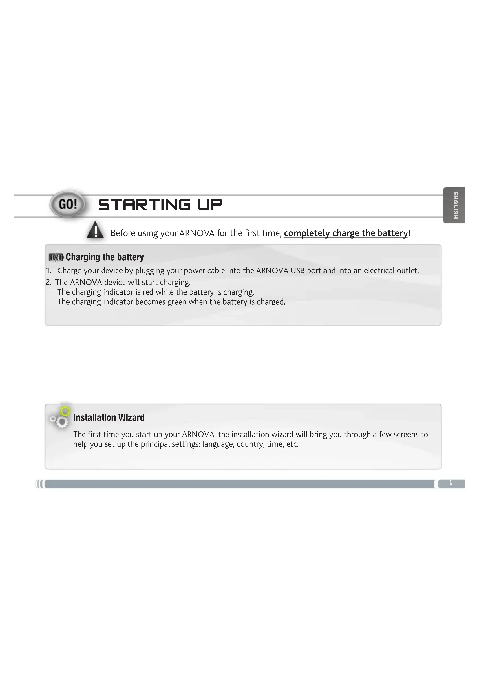 ENGLISH STARTING UP Before using your ARNOVA for the rst time, completely charge the battery!