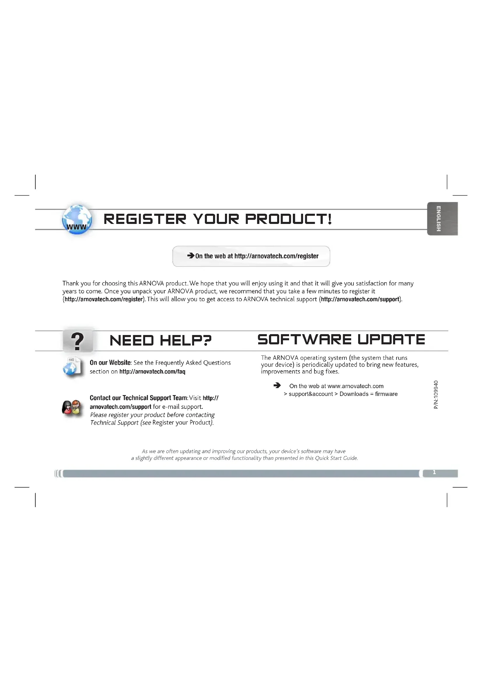 ENGLISHP/N:109940 NEED HELP? As we are often updating and improving our products, your device’s software may have a slightly different appearance or modified functionality than presented in this Quick Start Guide.On our Website: See the Frequently Asked Questions section on http://arnovatech.com/faq