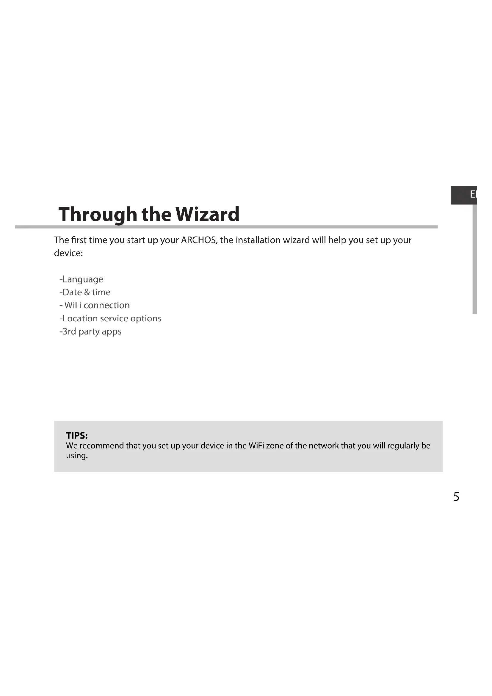 Power connector ON/OFF button Camera Back of the device5 ENEN Through the Wizard The rst time you start up your ARCHOS, the installation wizard will help you set up your device: - Language - Date & time - WiFi connection - Location service options - 3rd party apps TIPS: We recommend that you set up your device in the WiFi zone of the network that you will regularly be using.6