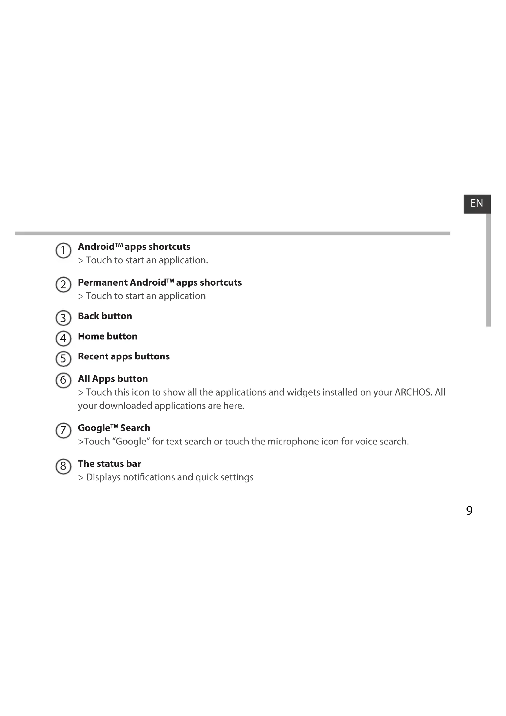 apps shortcuts > Touch to start an application Back button Home button Recent apps buttons All Apps button > Touch this icon to show all the applications and widgets installed on your ARCHOS. All your downloaded applications are here. Google