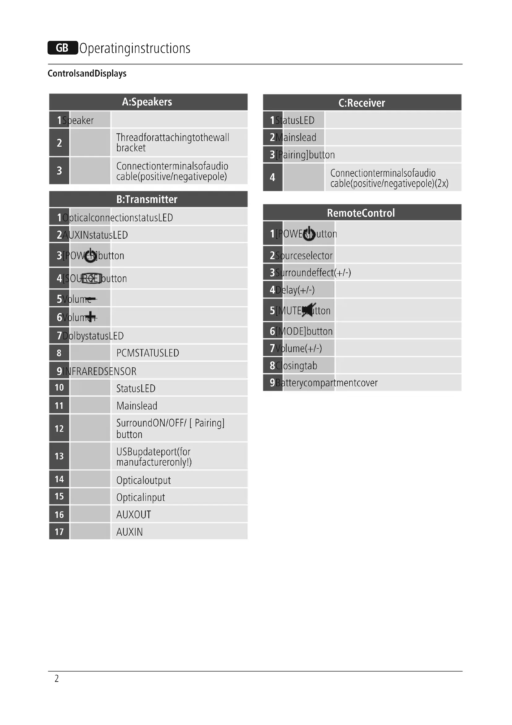 AUX IN C: Receiver 1 Status LED 2 Mains lead 3 [Pairing] button