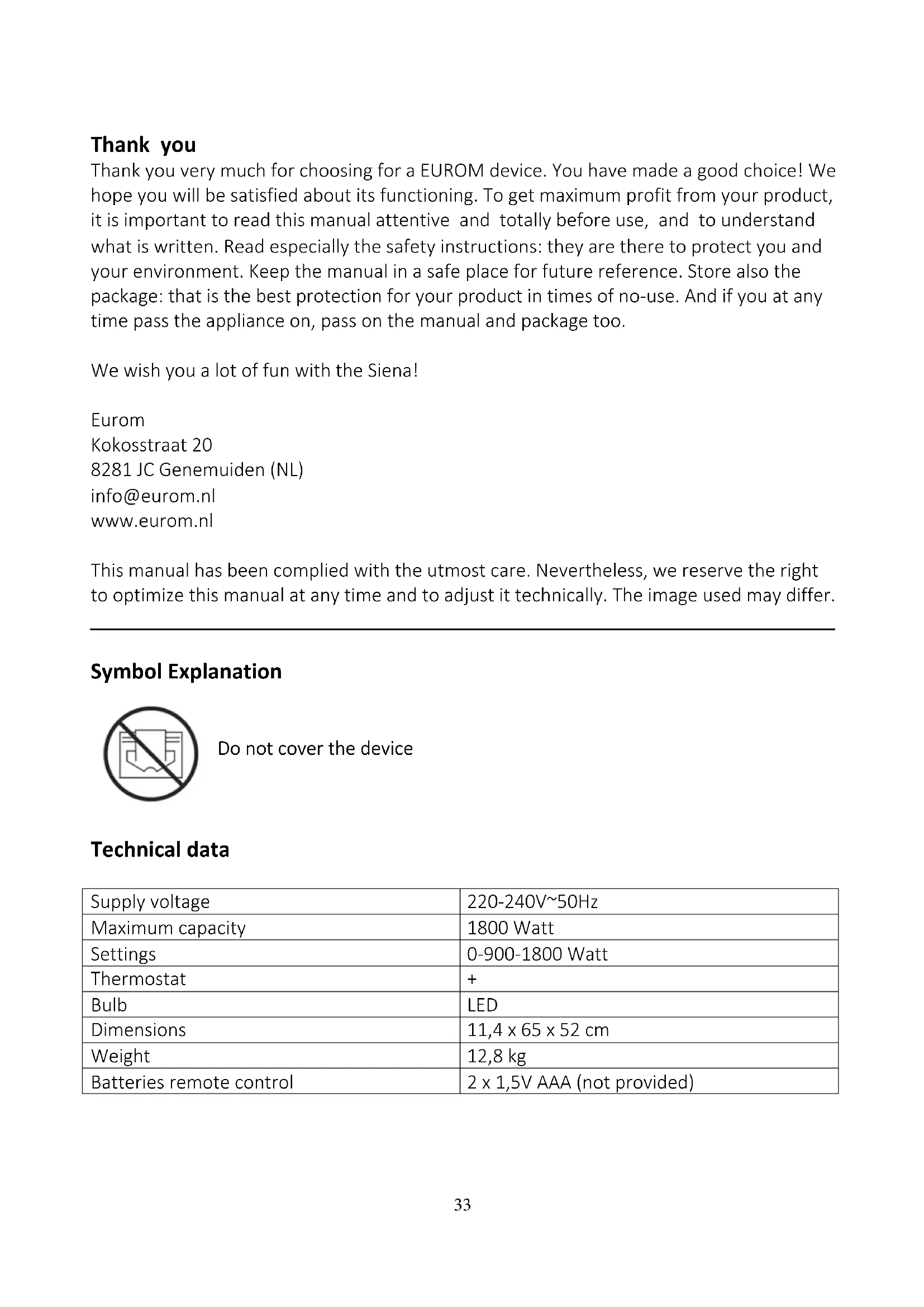 - To erase the timer setting, press on the TIMER SET button. 01 will start flashing on the display. Using the + and - buttons, look for the setting number that you want to erase and subsequently press on the C button (erasing the timer setting). The timer setting will disappear immediately. ATTENTION! If you want the stove to operate according to a timer programme, it will not only have to remain on stand-by, but also switched on (using the ON/OFF button). If this is not necessary, always switch off the stove using the ON/OFF button, switch off the main switch and remove the plug from the socket. ATTENTION! Day and time are deleted if the electricity is cut off. This happens not only when the plug is pulled out of the socket, but also if the main switch is set to O (OFF). The timer settings however are stored. When the electricity is restored and the timer settings are entered, then you need to reset the day and hour settings immediately; otherwise the time will begin at 0.00! If you do not enter any orders for approx. 15 seconds, the display will turn off. Pressing any random button will reactivate the display. Switching off If you are not using the stove, you must switch it off using the main switch (you press O) and remove the plug from the socket. Doing this will erases all the settings, also day and time. Only the timer settings are stored. Safety feature The Siena atmospheric fireplace is equipped with an overheating safeguard. In case of internal overheating, the overheating safeguard will switch the heater off. This may occur if the heater cannot give off enough heat or if it cannot draw in enough fresh air. As mentioned above, this is generally caused by (partially) covering the heater, obstructing the air intake and/or outlet grills or installing the heater too close to a wall or something similar. If this happens, turn the fireplace off by switching the main switch to O and remove the plug from the socket. Leave the fireplace to cool down for at least 15 minutes and remove the cause of overheating. You can then switch the fireplace back on. If the device overheats again or you cannot ascertain the reason for this, take the fireplace to your service point to be checked/repaired. Important! For safety reasons the fire will not automatically restart after overheating. Check whether conditions are safe before switching it on! So never switch on the heater44 by means of a timer and never connect it to a power supply that regularly switches on and off. Cleaning and maintenance Always remove the plug from the socket and let the fireplace cool down before cleaning or touching. The Siena atmospheric fireplace does not need much maintenance. Always keep the in- and outlet openings clean and dust-free. Use a soft cloth or a soft brush to clean the outside of the metal case. The glass plate can also be cleaned with a soft cloth. Do not use abrasive cleaning fluids or special glass cleaners! If the device malfunctions, immediately remove the plug from the socket and take to a service point. Do not carry out repairs yourself and always ask for original parts to be used. If the fireplace is to be stored after the winter period, clean it, pack it in original packaging if possible and store in a cool, dry and clean place. Make sure the fireplace is kept upright. Problems and solutions If the fireplace will not work check the electrical supply. Is the socket working properly? Has the fuse blown? If the fireplace stops working suddenly, it may mean that the overheating safeguard has been triggered (see under ‘Safeguards’). In the event of other defects, immediately switch the fireplace off, remove the plug from the socket and consult a supplier or recognised electrician. Never carry out repairs yourself as this invalidates the guarantee and may be dangerous! Disposal At its end of life, discard the device according to the local laws and regulations, or deliver the device to your supplier.45 Remerciements Nous vous remercions d’avoir choisi un appareil EUROM. Vous avez fait un excellent choix ! Nous espérons que ce produit fonctionnera à votre entière satisfaction. Pour que vous profitiez au maximum de votre appareil, nous vous recommandons de lire attentivement et de bien comprendre le contenu intégral de ce mode d’emploi avant toute utilisation. Accordez une attention particulière aux consignes de sécurité, qui sont indiquées pour votre sécurité et celle de votre entourage ! Conservez ensuite le mode d’emploi afin de pouvoir le consulter ultérieurement. Conservez également l’emballage : celui-ci apporte la meilleure protection de votre appareil pendant son entreposage hors saison. Si vous cédez l’appareil à une autre personne, remettez-lui également le mode d’emploi et l’emballage. Nous vous souhaitions beaucoup de plaisir avec le Siena! Eurom Kokosstraat 20 8281 JC Genemuiden (NL) info@eurom.nl www.eurom.nl Ce manuel a été rédigé avec le plus grand soin. Néanmoins, nous nous réservons le droit d’optimiser ce manuel à tout moment et de le modifier techniquement. Les images utilisées peuvent différer.