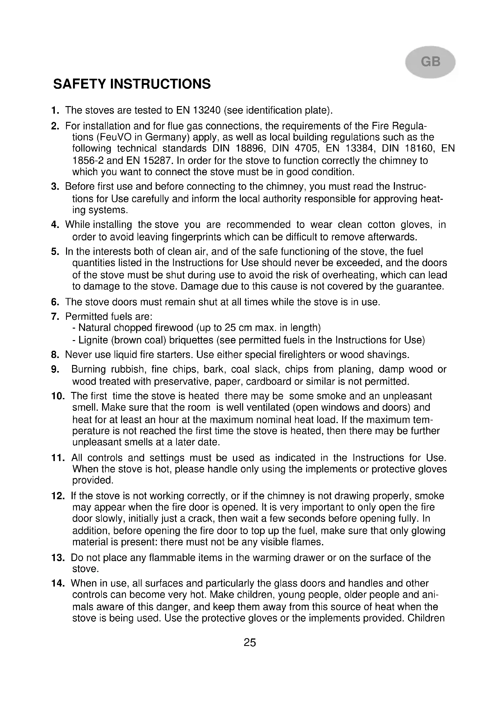 - Natural chopped firewood (up to 25 cm max. in length) - Lignite (brown coal) briquettes (see permitted fuels in the Instructions for Use)
