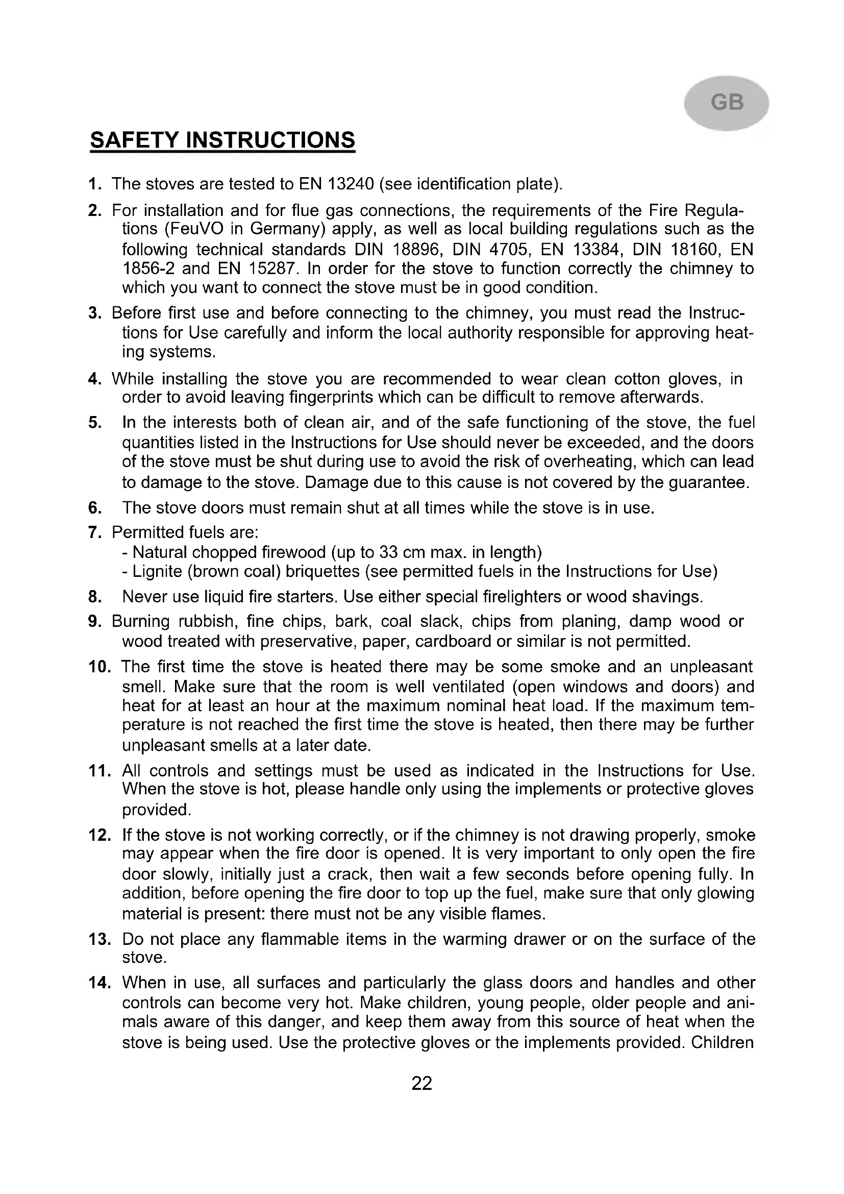 For installation and for connection of flue, the requirements of the Fire Regulations (FeuVO in Germany) apply, as well as local building regulations such as the follow-ing technical standards DIN 18896, DIN 4705, EN 13384, DIN 18160, EN 1856-2 and EN 15287. In order for the stove to function correctly the chimney to which you want to connect the stove must be in good condition.