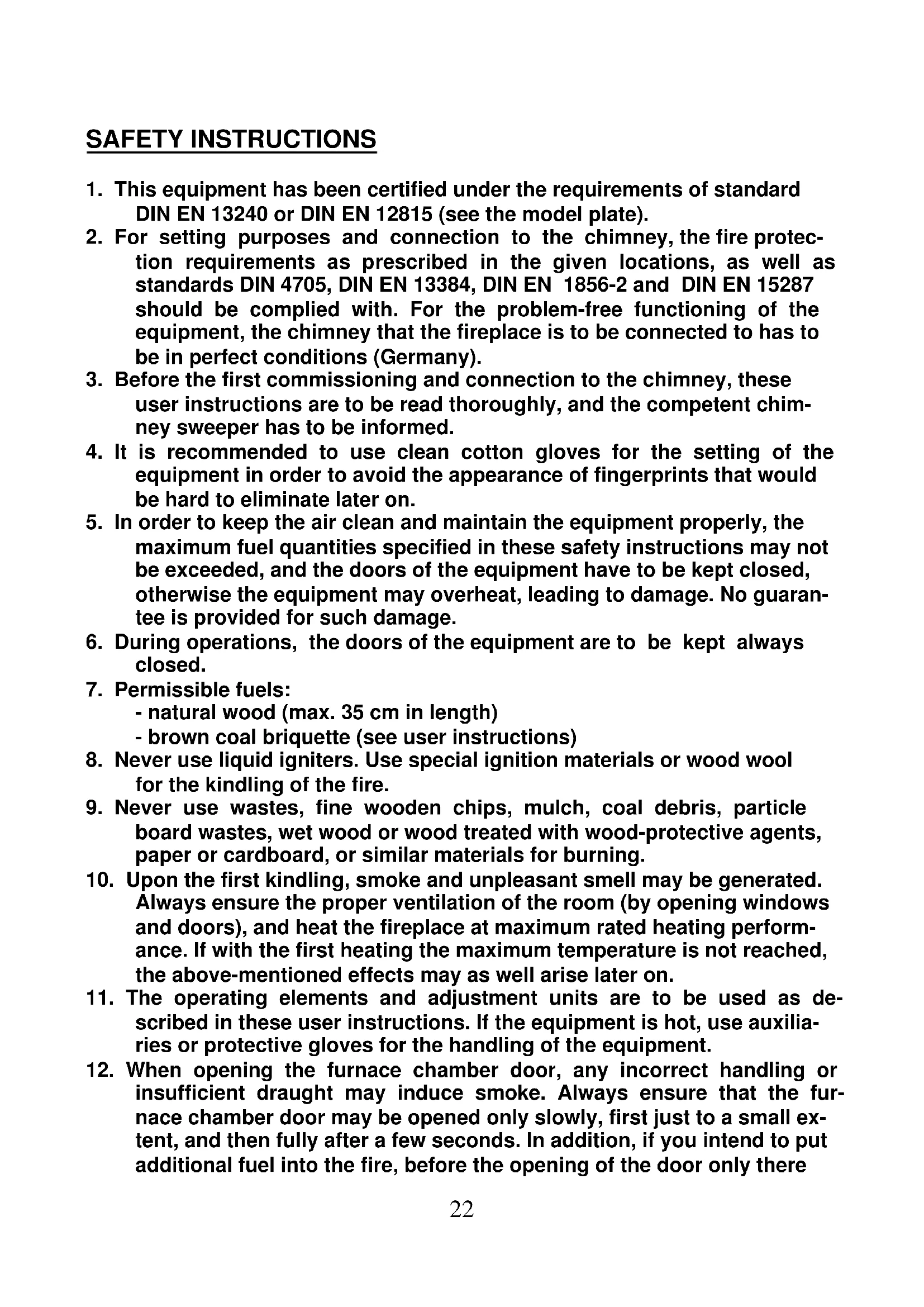 imperfect suction of the generated flue gases. In such cases, the fire- place is to be filled with smaller quantities of fuel, preferably wooden chips or wood wool, and it is to be commissioned under control with the stabilization of the chimney draught. The fire grate should always be kept clean.