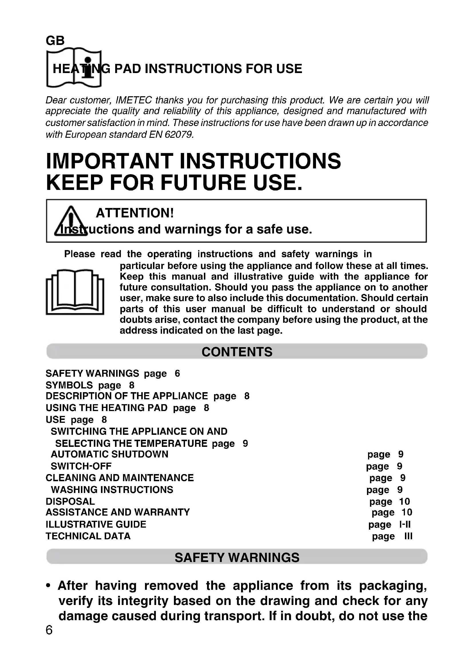Dear customer, IMETEC thanks you for purchasing this product. We are certain you will appreciate the quality and reliability of this appliance, designed and manufactured with customer satisfaction in mind. These instructions for use have been drawn up in accordance with European standard EN 62079. IMPORTANT INSTRUCTIONS KEEP FOR FUTURE USE. ATTENTION! Instructions and warnings for a safe use. Please read the operating instructions and safety warnings in particular before using the appliance and follow these at all times. Keep this manual and illustrative guide with the appliance for future consultation. Should you pass the appliance on to another user, make sure to also include this documentation. Should certain parts of this user manual be difficult to understand or should doubts arise, contact the company before using the product, at the address indicated on the last page. CONTENTS SAFETY WARNINGS page 6 SYMBOLS page 8 DESCRIPTION OF THE APPLIANCE page 8 USING THE HEATING PAD page 8 USE page 8