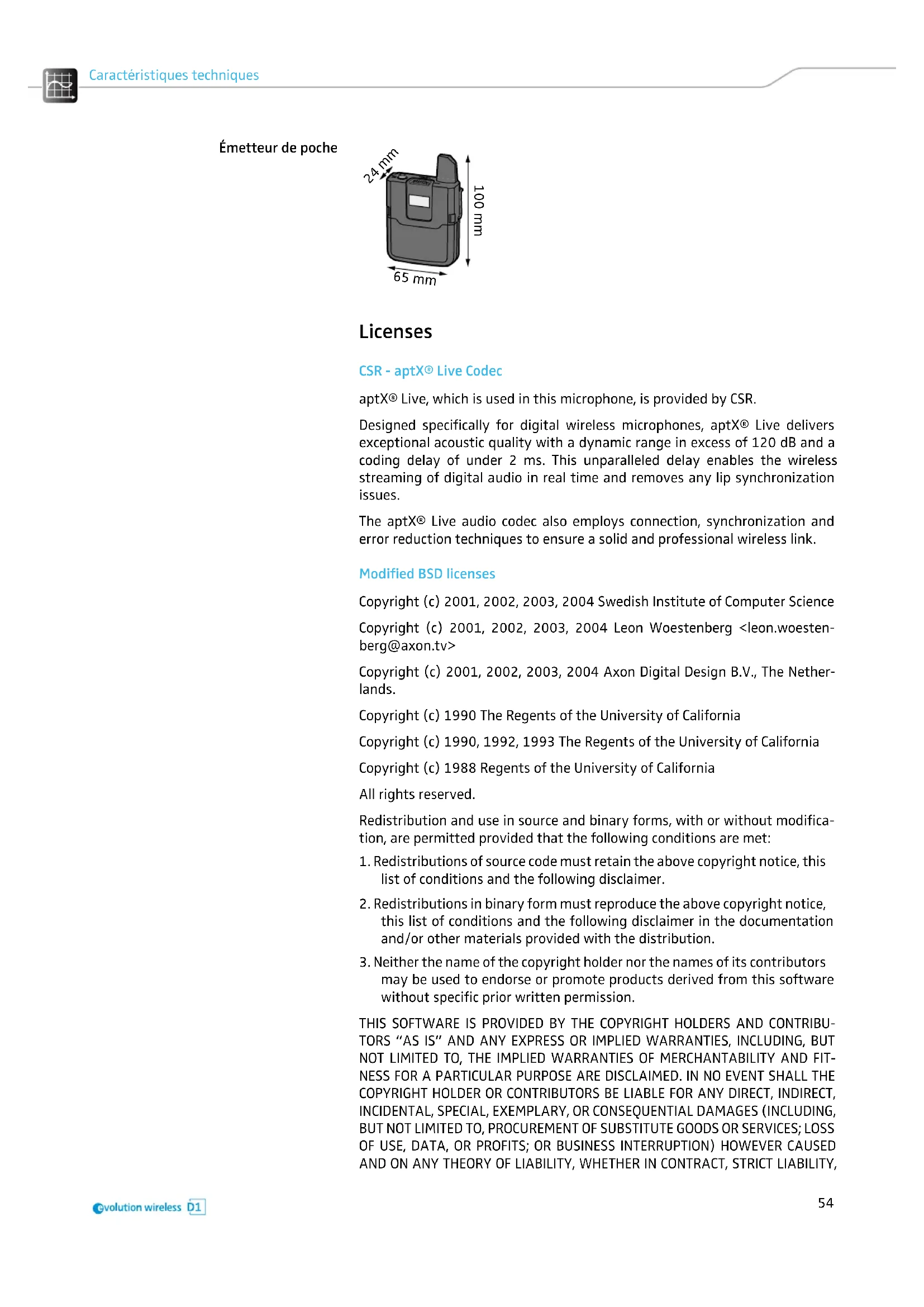 may be used to endorse or promote products derived from this software without specific prior written permission. THIS SOFTWARE IS PROVIDED BY THE COPYRIGHT HOLDERS AND CONTRIBU- TORS “AS IS” AND ANY EXPRESS OR IMPLIED WARRANTIES, INCLUDING, BUT NOT LIMITED TO, THE IMPLIED WARRANTIES OF MERCHANTABILITY AND FIT- NESS FOR A PARTICULAR PURPOSE ARE DISCLAIMED. IN NO EVENT SHALL THE COPYRIGHT HOLDER OR CONTRIBUTORS BE LIABLE FOR ANY DIRECT, INDIRECT, INCIDENTAL, SPECIAL, EXEMPLARY, OR CONSEQUENTIAL DAMAGES (INCLUDING, BUT NOT LIMITED TO, PROCUREMENT OF SUBSTITUTE GOODS OR SERVICES; LOSS OF USE, DATA, OR PROFITS; OR BUSINESS INTERRUPTION) HOWEVER CAUSED AND ON ANY THEORY OF LIABILITY, WHETHER IN CONTRACT, STRICT LIABILITY, 100 mm 65 mm 24 mm55 Caractéristiques techniques OR TORT (INCLUDING NEGLIGENCE OR OTHERWISE) ARISING IN ANY WAY OUT OF THE USE OF THIS SOFTWARE, EVEN IF ADVISED OF THE POSSIBILITY OF SUCH DAMAGE. GNU GPL version 2 To obtain the source code of software components licensed under the GPL v2, please submit a written request to us. Our contact data can be found on the back page of the Specifications booklet. Ubuntu Font License Version 1.0 Preamble This license allows the licensed fonts to be used, studied, modified and redis- tributed freely. The fonts, including any derivative works, can be bundled, embedded, and redistributed provided the terms of this license are met. The fonts and derivatives, however, cannot be released under any other license. The requirement for fonts to remain under this license does not require any document created using the fonts or their derivatives to be published under this license, as long as the primary purpose of the document is not to be a vehicle for the distribution of the fonts. Permission & Conditions This license does not grant any rights under trademark law and all such rights are reserved. Permission is hereby granted, free of charge, to any person obtaining a copy of the Font Software, to propagate the Font Software, subject to the below conditions: