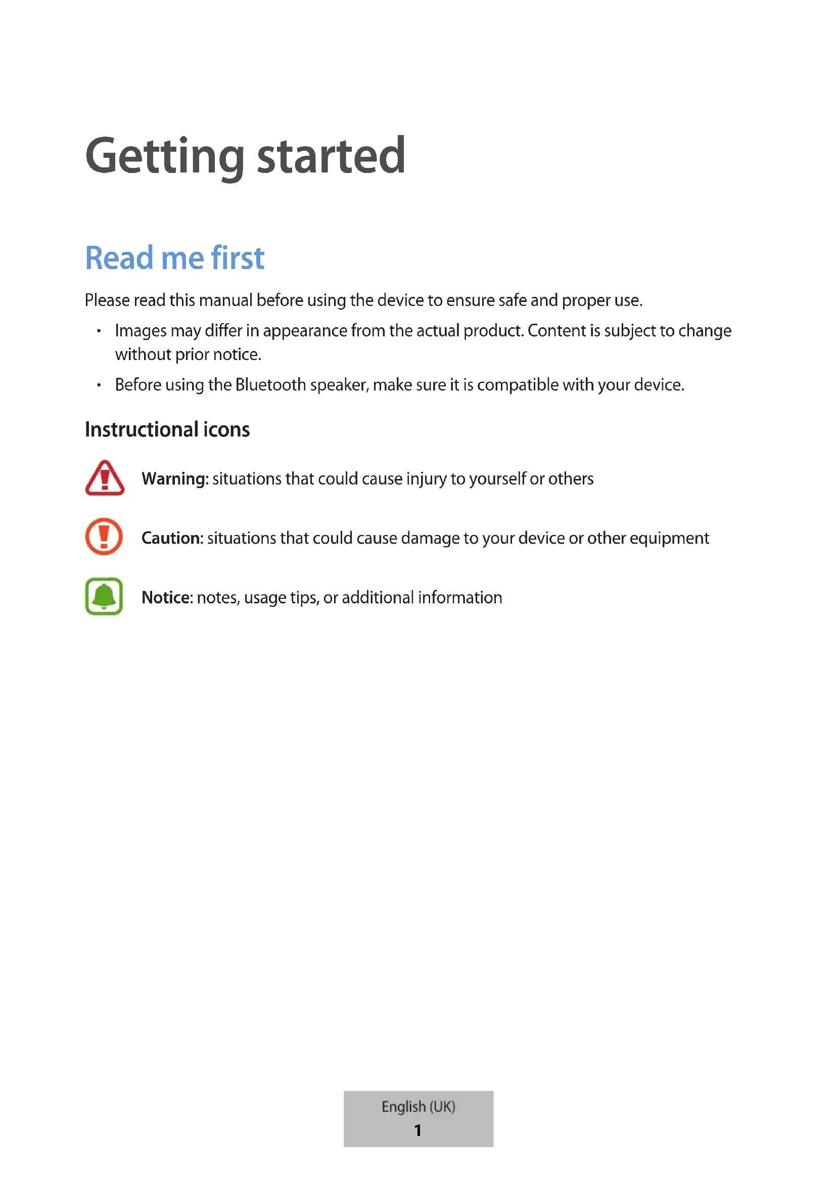 Caution: situations that could cause damage to your device or other equipment Notice: notes, usage tips, or additional information English (UK) 1Getting started
