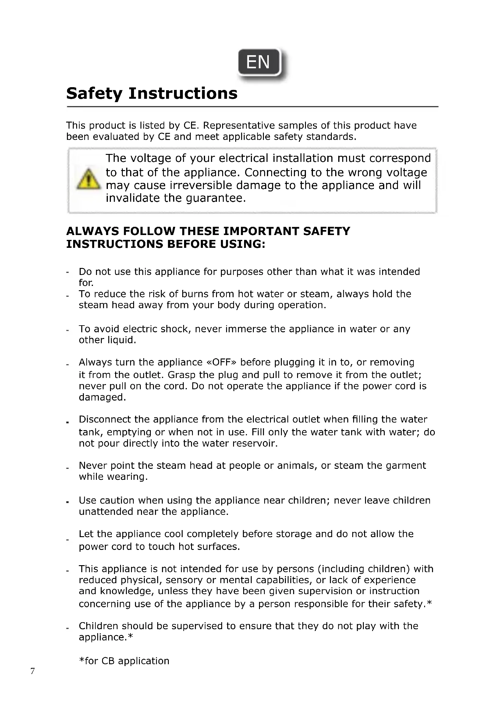 INSTRUCTIONS BEFORE USING: This product is listed by CE. Representative samples of this product have been evaluated by CE and meet applicable safety standards. Do not use this appliance for purposes other than what it was intended for. To reduce the risk of burns from hot water or steam, always hold the steam head away from your body during operation. To avoid electric shock, never immerse the appliance in water or any other liquid. Always turn the appliance «OFF» before plugging it in to, or removing it from the outlet. Grasp the plug and pull to remove it from the outlet; never pull on the cord. Do not operate the appliance if the power cord is damaged. Disconnect the appliance from the electrical outlet when lling the water tank, emptying or when not in use. Fill only the water tank with water; do not pour directly into the water reservoir. Never point the steam head at people or animals, or steam the garment while wearing. Use caution when using the appliance near children; never leave children unattended near the appliance. Let the appliance cool completely before storage and do not allow the power cord to touch hot surfaces. This appliance is not intended for use by persons (including children) with reduced physical, sensory or mental capabilities, or lack of experience and knowledge, unless they have been given supervision or instruction concerning use of the appliance by a person responsible for their safety.* Children should be supervised to ensure that they do not play with the appliance.* *for CB application The voltage of your electrical installation must correspond to that of the appliance. Connecting to the wrong voltage may cause irreversible damage to the appliance and will invalidate the guarantee. EN8 This appliance can be used by children aged from 8 years old and above and persons with reduced physical, sensory or mental capabilities or lack of experi- ence and knowledge if they have been given supervision or instruction concern- ing use of the appliance in a safe way and understand the hazards involved. Children shall not be play with the appliance. Cleaning and user maintenance shall not be made by children without supervision. For optimal use of the appliance, see “Maintenance” and “lling” on the quick start. If the supply cord is damaged, it must be replaced by the manufacturer, its service agent or similarly qualied persons in order to avoid a hazard. Care should be taken when using the appliance due to the emission of steam. Disconnect the appliance from the electrical outlet when lling the water tank, cleaning, emptying or when not in use. EN9 Do not operate the appliance if it has been dropped or damaged. To avoid the risk of injury, re or electric shock, do not attempt to disas- semble or repair the appliance; take it to a qualied service center for repair. Use caution when emptying the water tank after use; water in the tank may be hot. Do not touch metal parts until the unit has cooled to avoid the risk of burns; use caution when changing attachments, they may be hot or contain hot water. Always keep the hose and nozzle elevated above the water tank. Steam in an up and down vertical motion. Using the steamer in a horizon- tal position or tilting it back may result in hot water discharge. Always hang the steam head on the head support/hook. Never place the steam head on the oor, furniture or lay it on the power cord while it is hot or plugged in as this may result in re or electric shock. Never drop or insert objects into the hose or any of the openings. The use of accessories and attachments other than those provided by SteamOne is not recommended and may result in re, electric shock or personal injury. This unit is for indoor use only. Do not cut or attempt to extend the steaming hose. To prevent overheating of the appliance, please be sure that the tele- scopic rod is extended to its highest position before hanging clothes on the garment hook for steaming. Do not allow the steamer to run dry. To avoid a circuit overload, do not operate another high wattage appliance on the same circuit. If necessary, use an extension cord specically designed for appliances, lesser cords may overheat. SPECIAL INSTRUCTIONS: To avoid a circuit overload, do not operate another high wattage appliance on the same circuit. If necessary, use an extension cord specically designed for appliances, lesser cords may overheat. EN10 Warranty SteamOne warranty This product is covered during the warranty period by SteamOne (contact details page 11) against any manufacturing defect. The warranty is valid for 2 years from the date of purchase and in the country specied. This SteamOne warranty is in addition to your consumer rights. All repair costs for a product recognized as having a defect are covered by the SteamOne warranty, in order to return it to a state of compliance with its original specications, either through repair, or possible replacement, of the defective parts. SteamOne may decide to oer a replacement product instead of repairing the defective one, depending on the situation. SteamOne’s obligations dened under the terms of this warranty are limited exclusively to repair or replacement, as stipulated above. Warranty terms and exclusions - The warranty period is that of the country of use of the product, even if the warranty period in the country of purchase is dierent. - The SteamOne warranty is only valid if local standards (voltage, electrical frequency, type of electric socket and all other local specications) are com- patible with the product. - The application of the SteamOne warranty may take longer if the model in question is not marketed in the country of use. - If the product covered by the warranty cannot be repaired in the country of use, the product may be replaced by an equivalent product or by another product of the same value wherever possible. - The SteamOne warranty is only valid upon presentation of proof of purchase and the warranty card (page 1