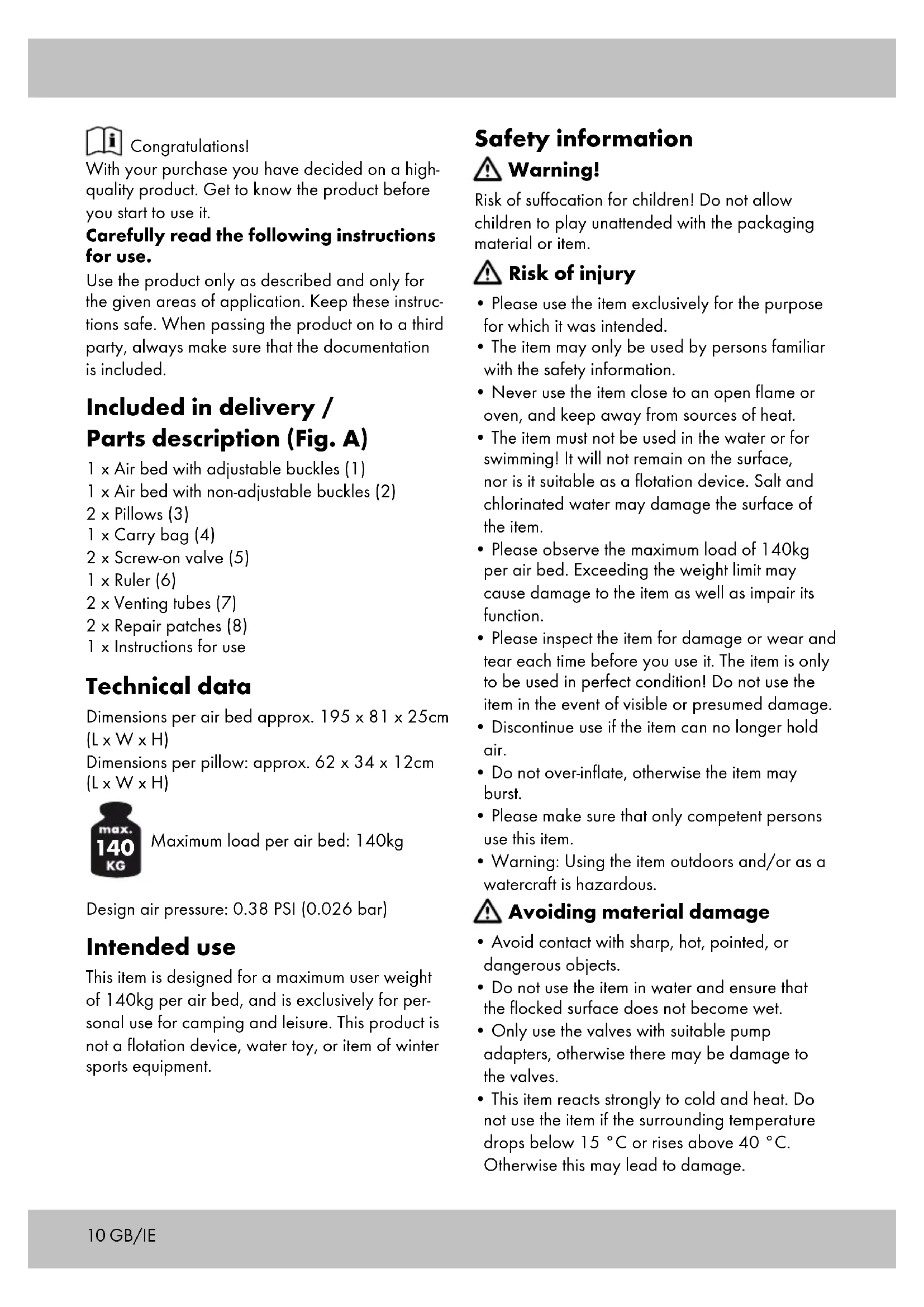 - Please observe the maximum load of 140kg per air bed. Exceeding the weight limit may cause damage to the item as well as impair its function.